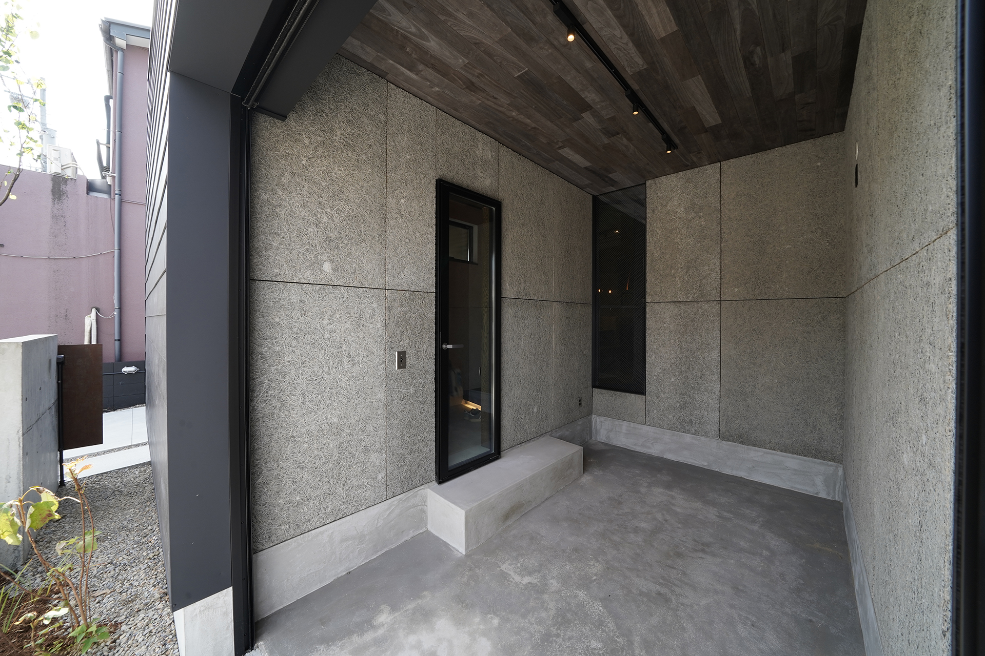木毛セメントとボルドーグレージュの天板で仕上げたガレージは、単なる収納ではなく“魅せる空間”。