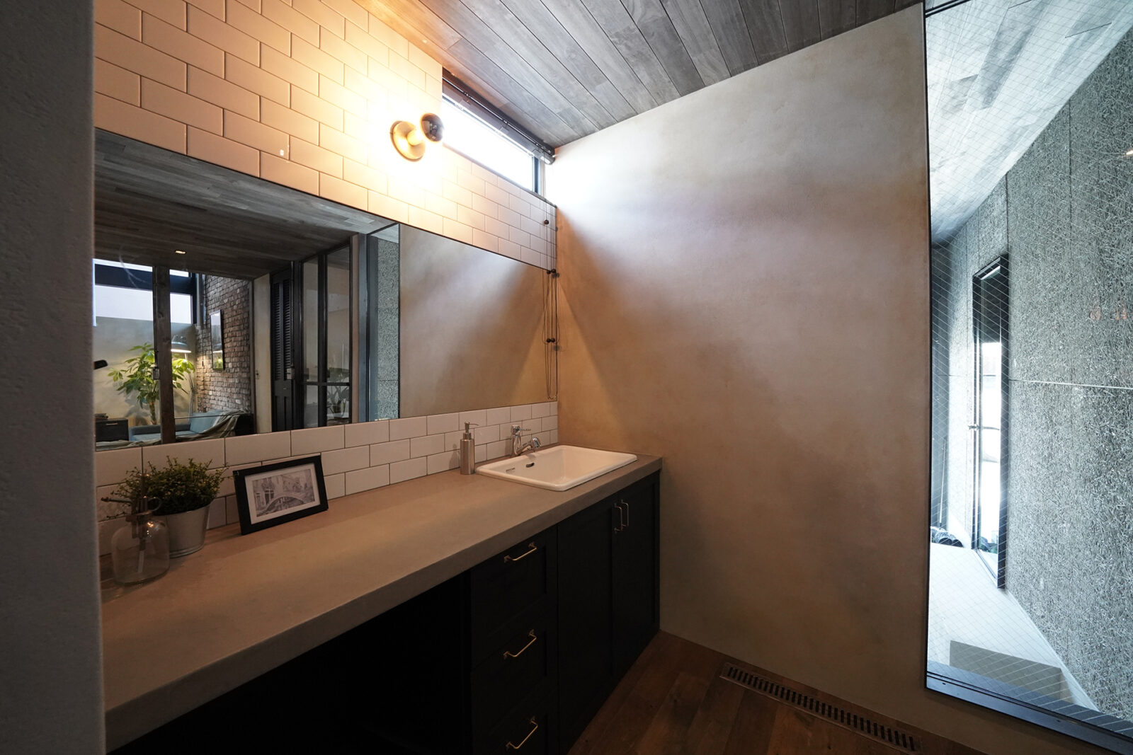 ブルックリンスタイルのレンガタイルにエイジング加工を施し、まるで海外のカフェやホテルのような雰囲気に。