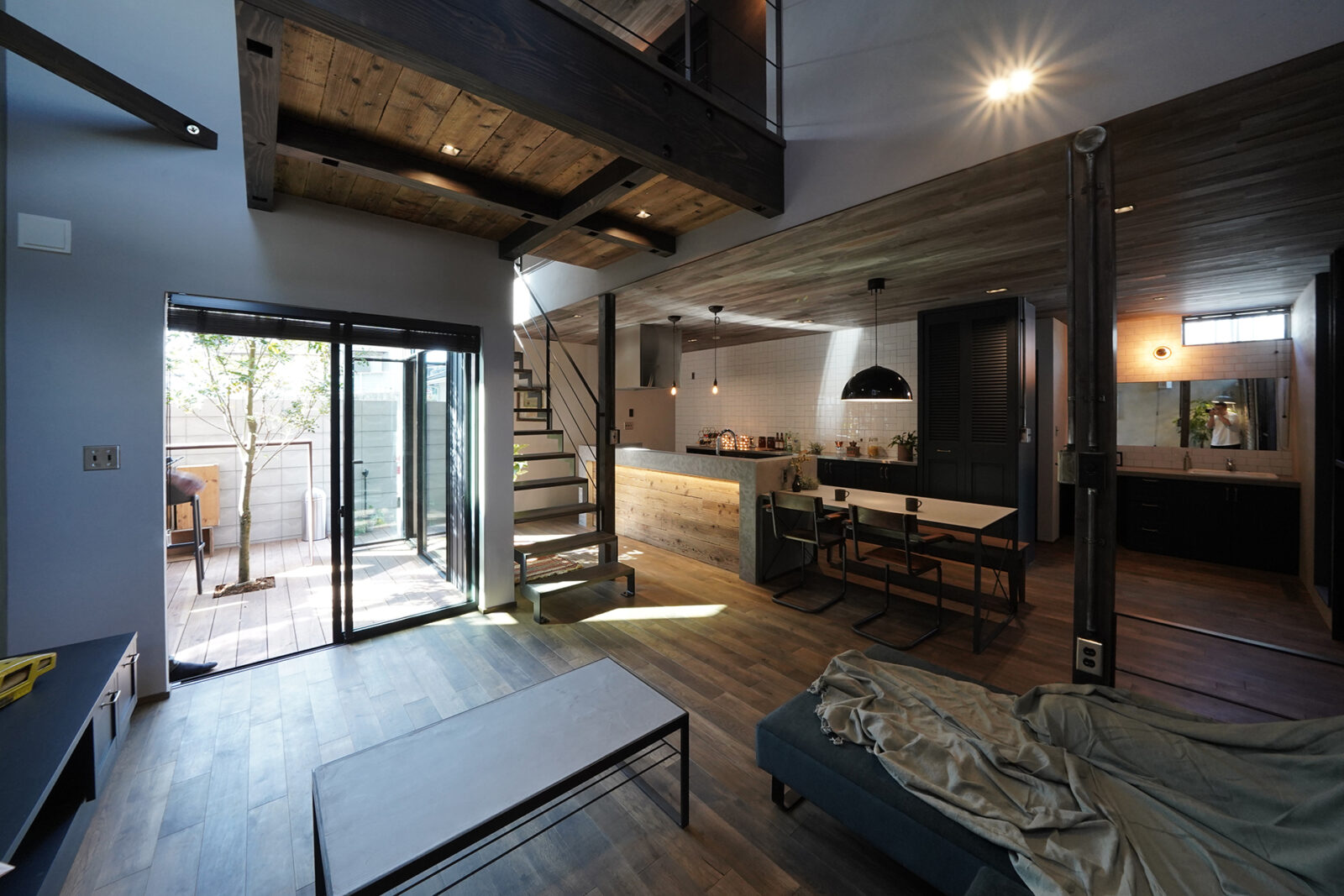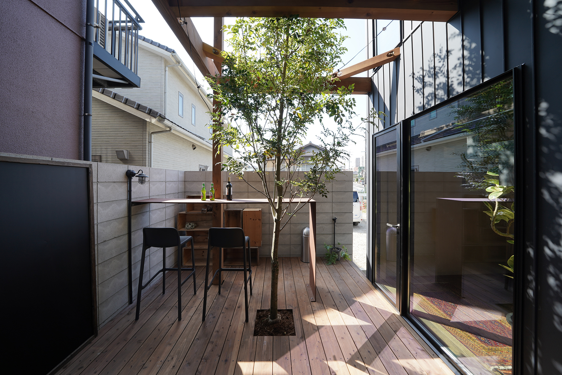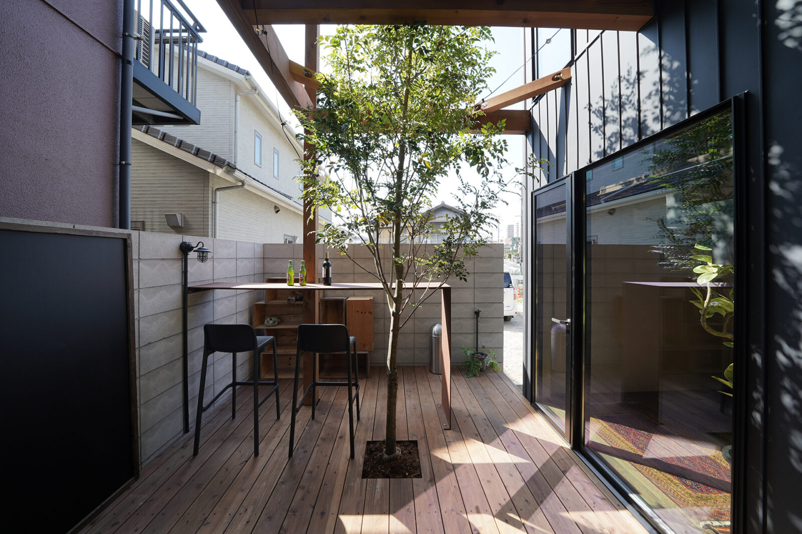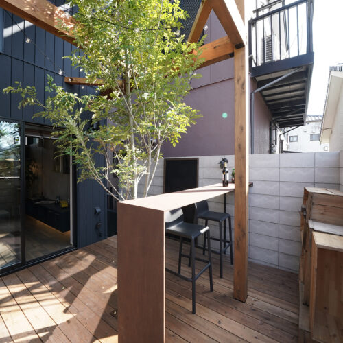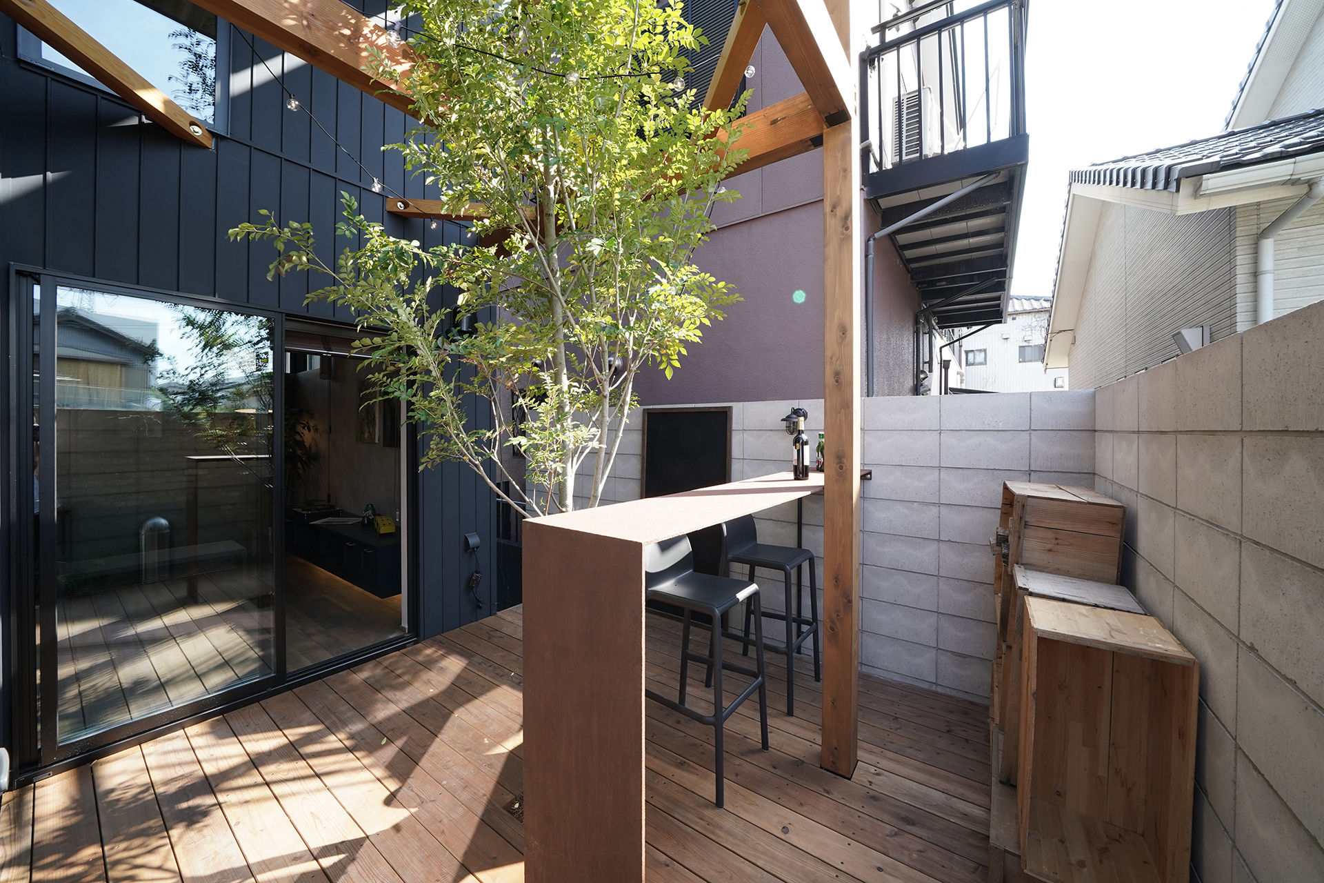 ウッドデッキと天井まで伸びるシマトネリコの一本木、アイアンのカウンターテーブルを配置した中庭。