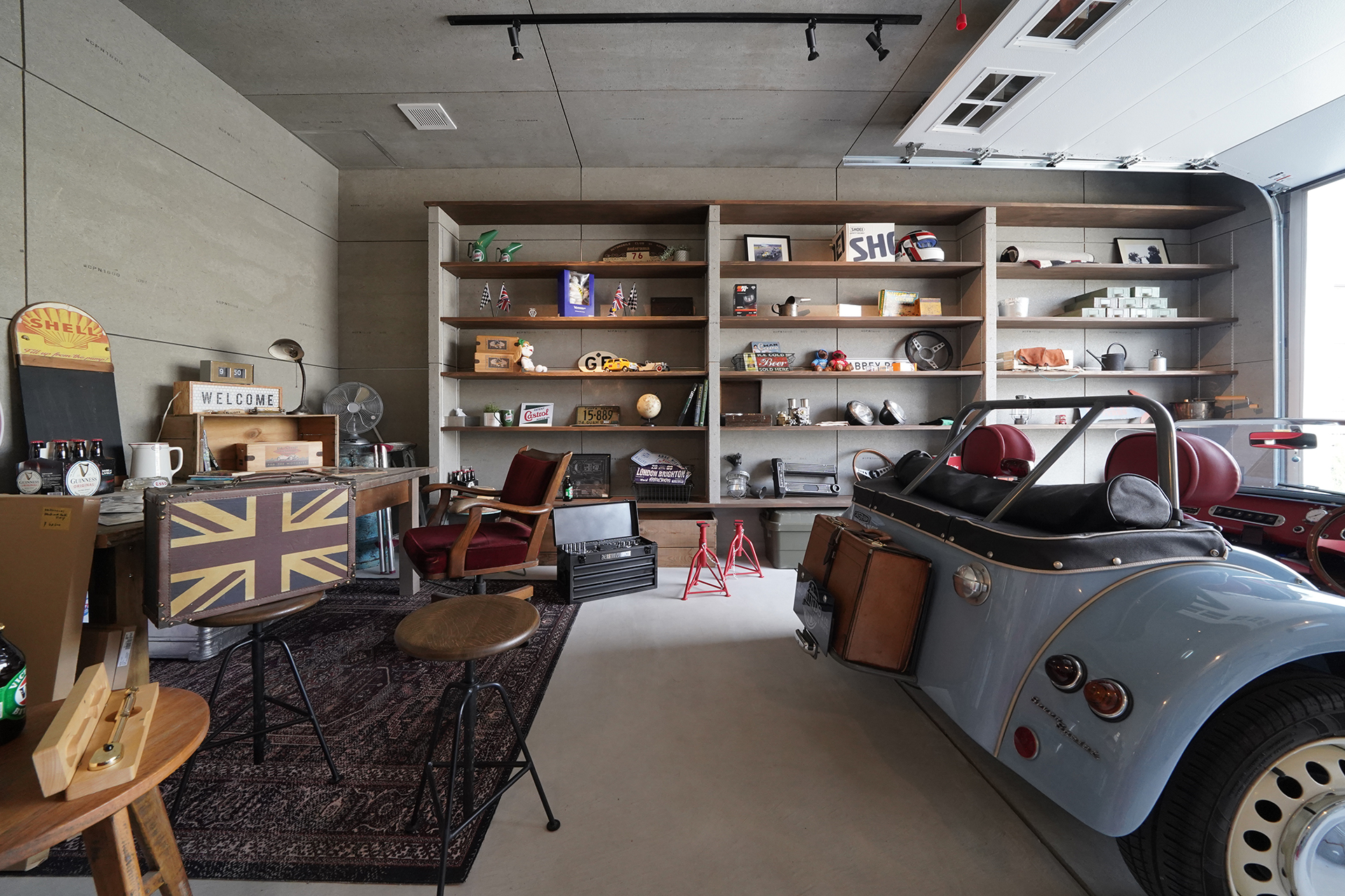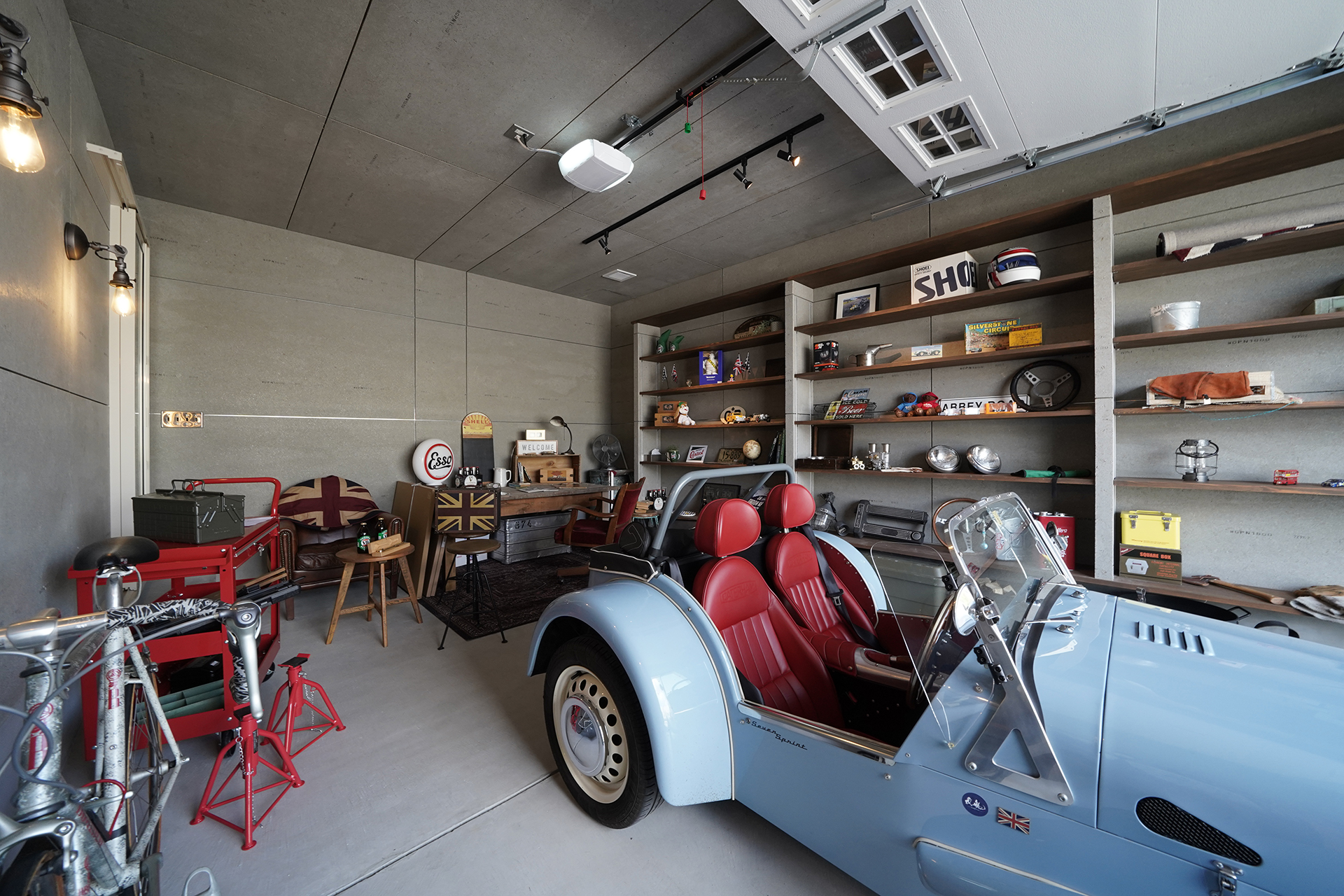 車やバイク、趣味の道具に囲まれた、自分だけの時間を楽しめる場所です。