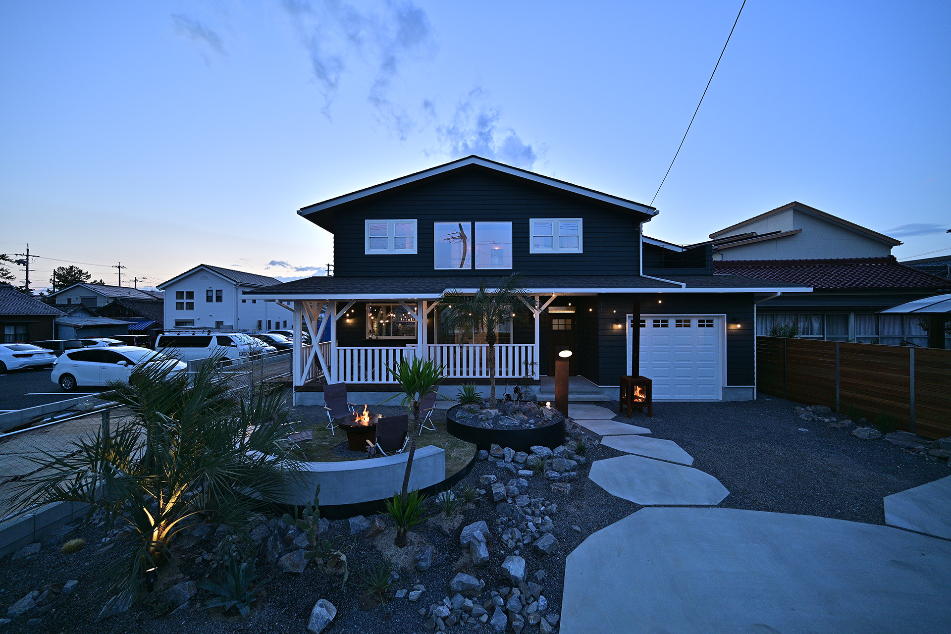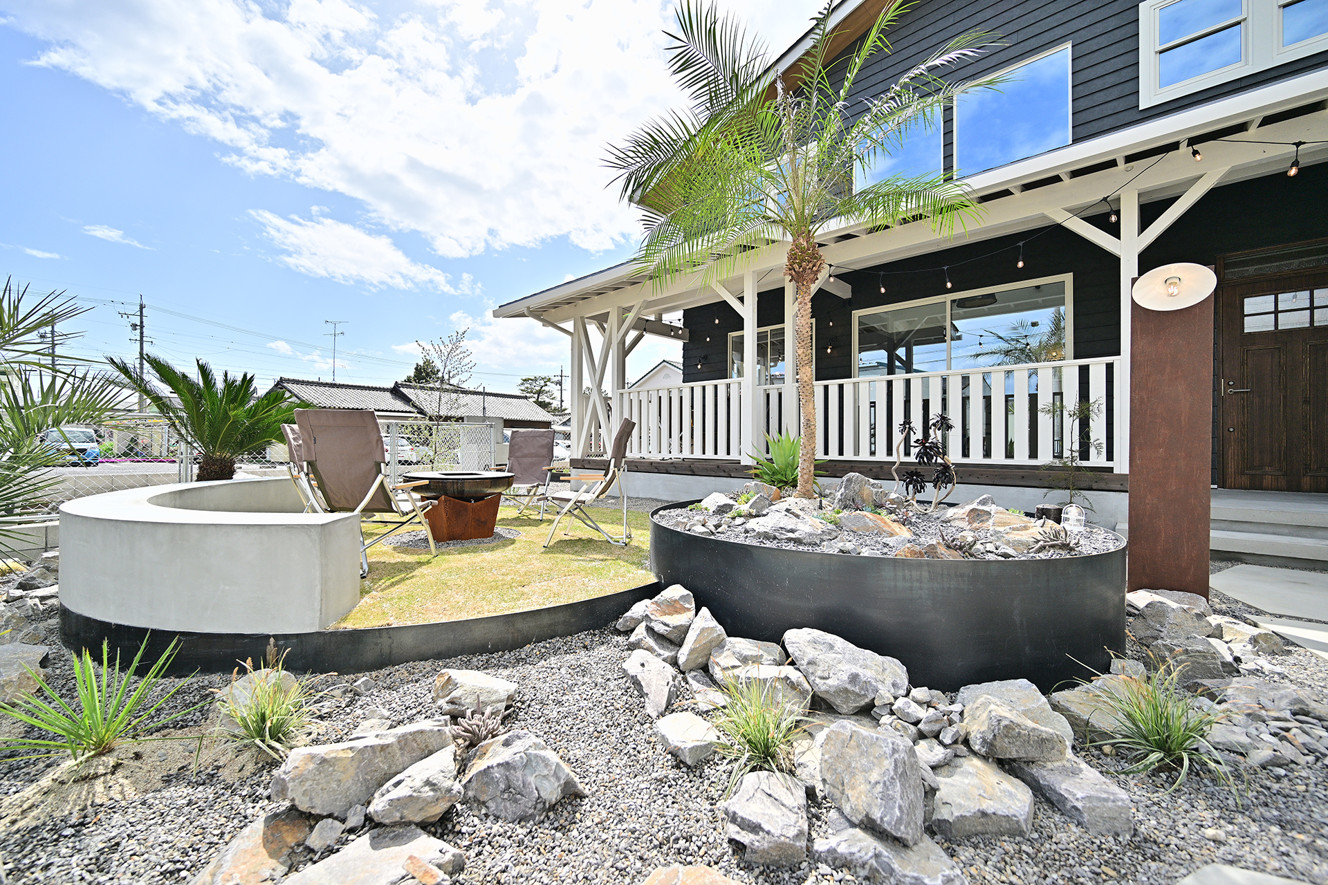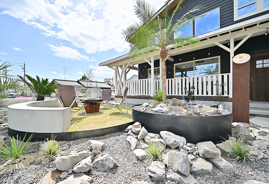 石とドライプランツでつくるロックガーデン、そしてファイヤーピットのある庭。