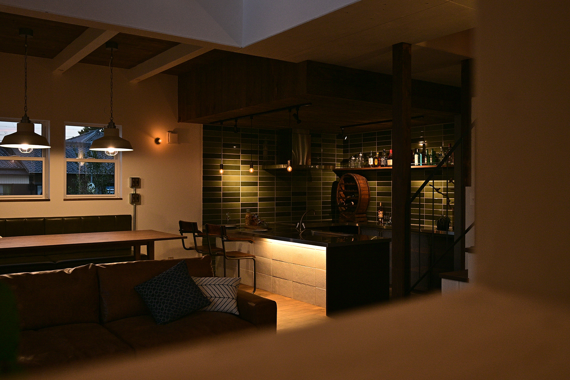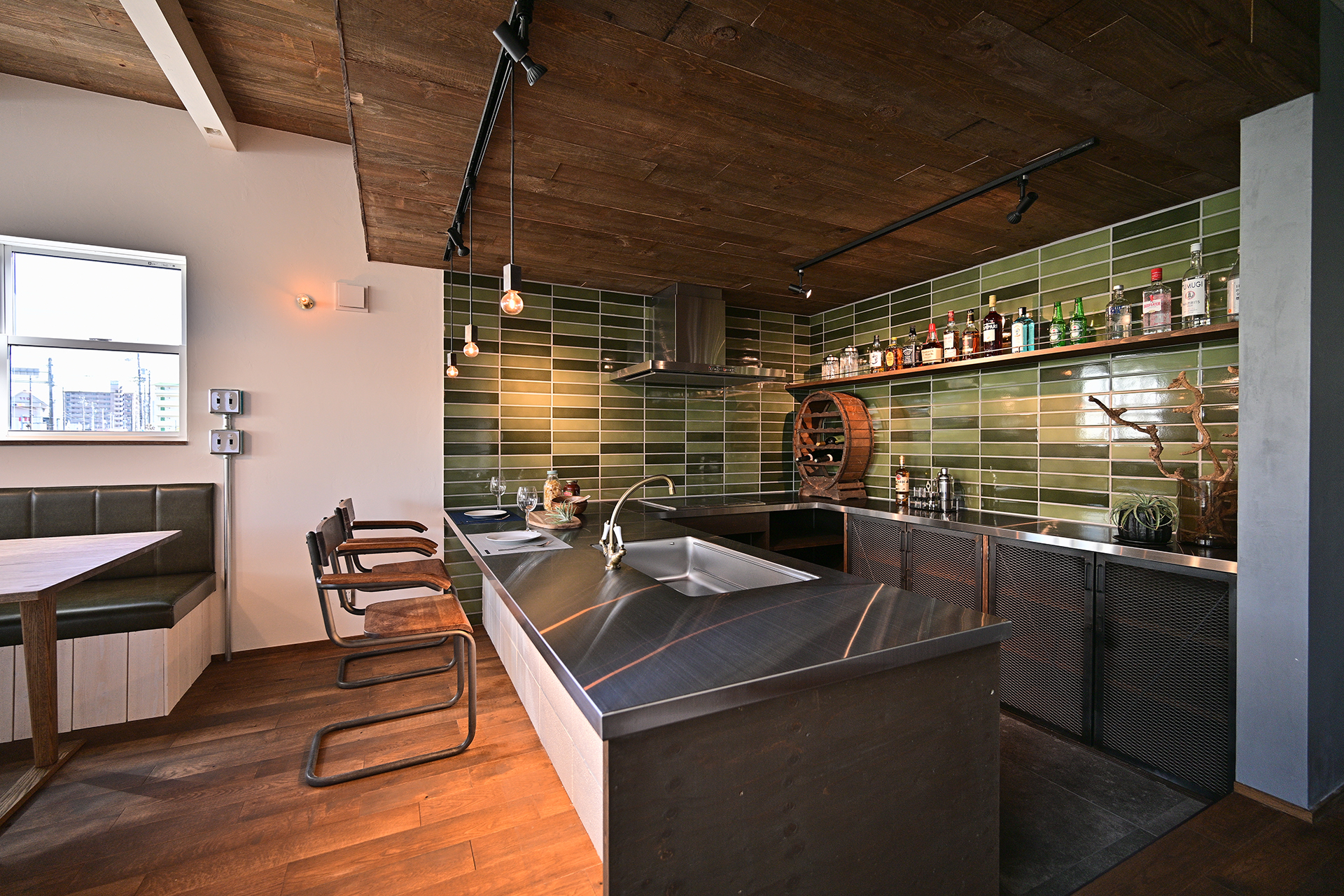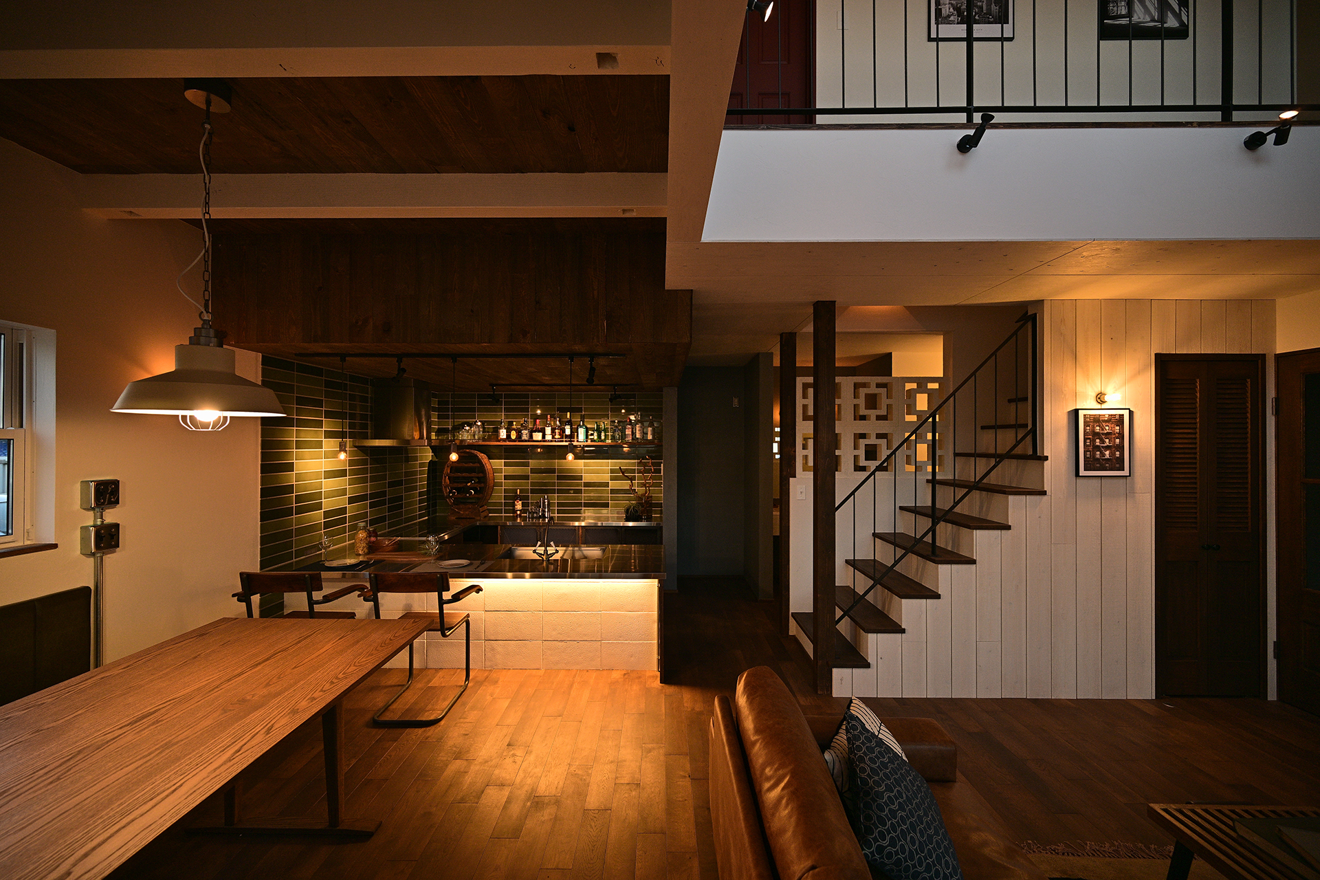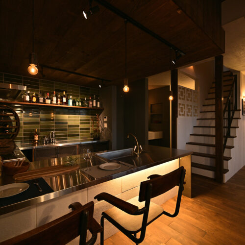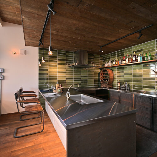 さらに、タイルの素材感やヴィンテージ照明のあたたかな光が重なり合い、それぞれ異なる素材が絶妙なバランスで調和した空間に仕上がりました。