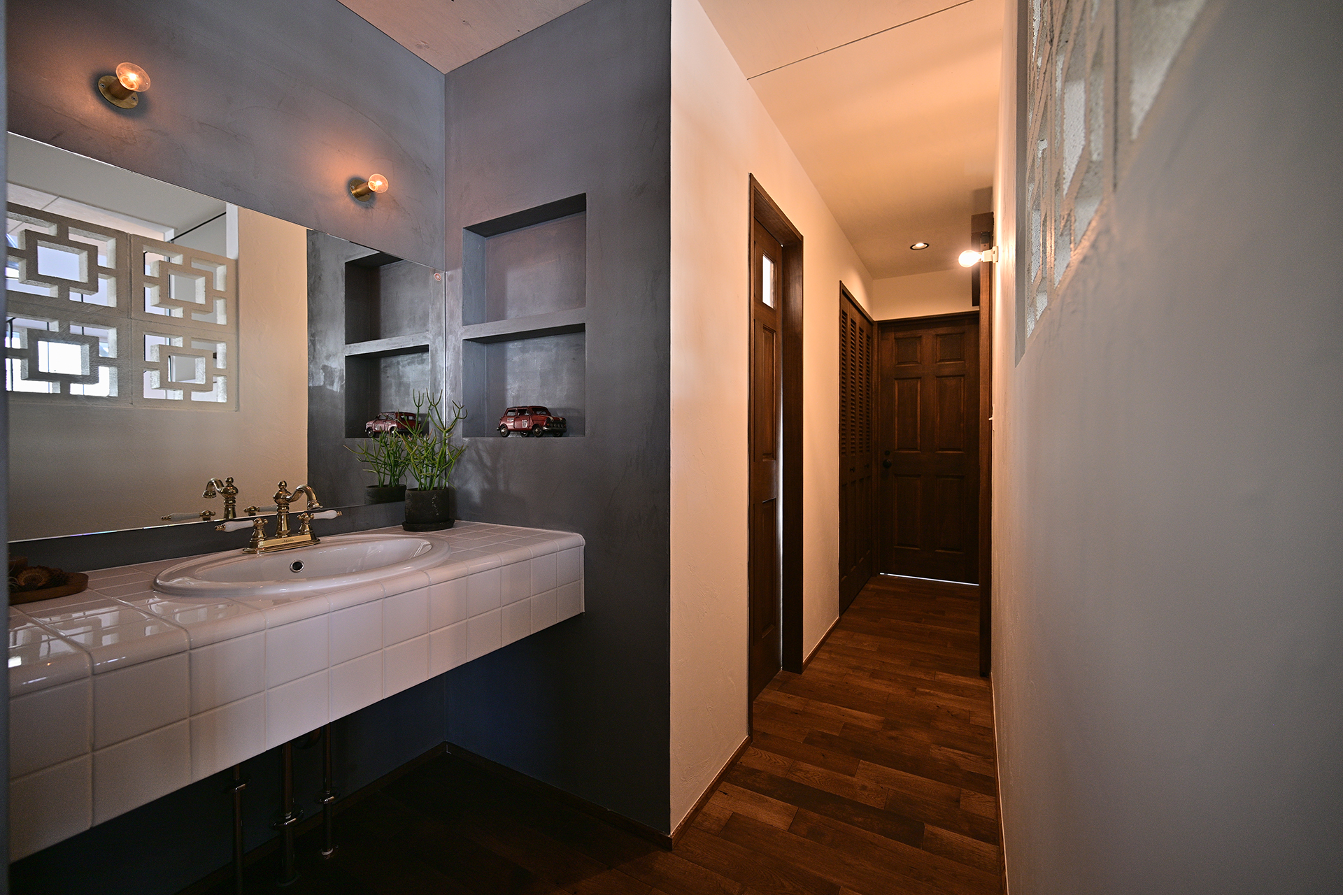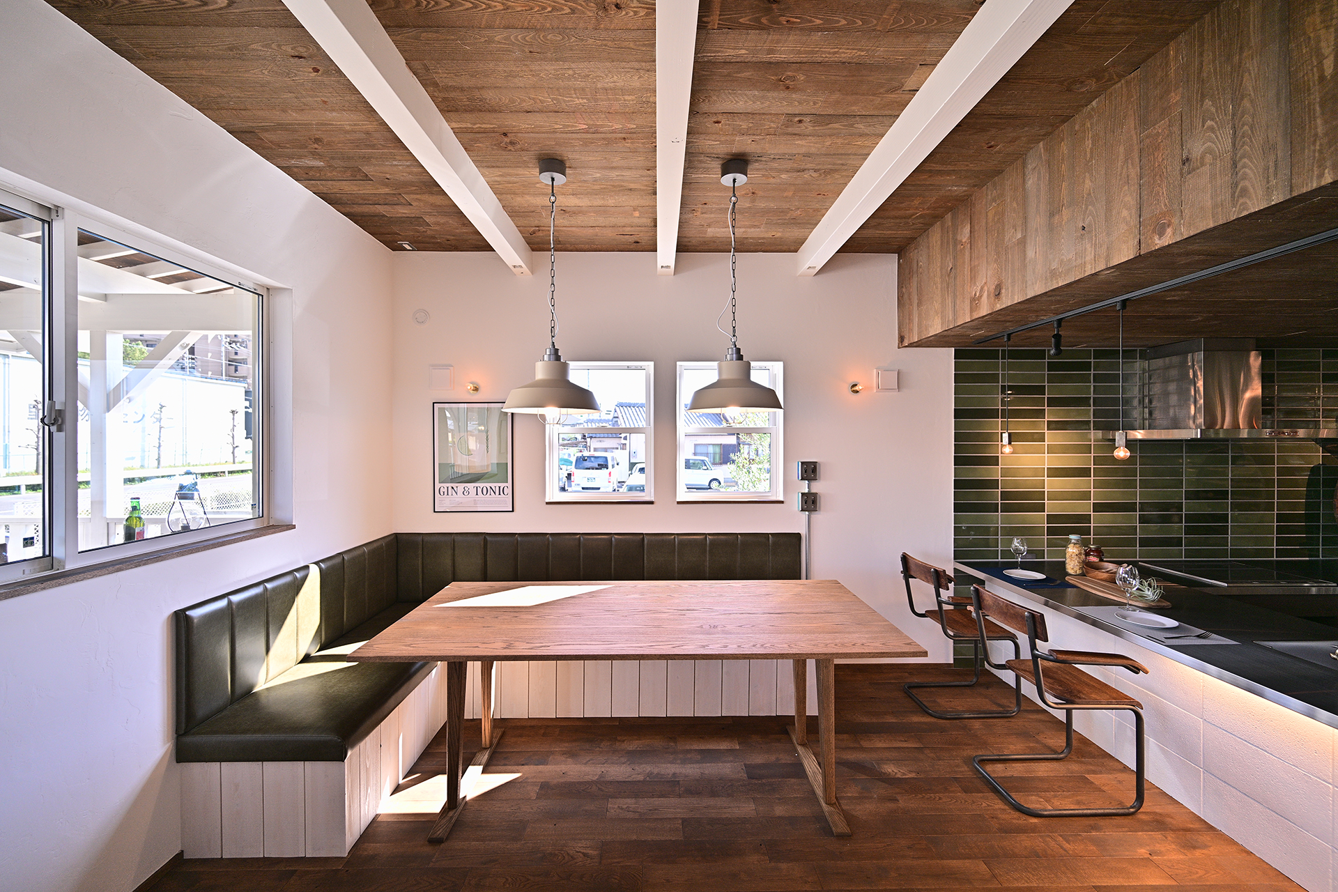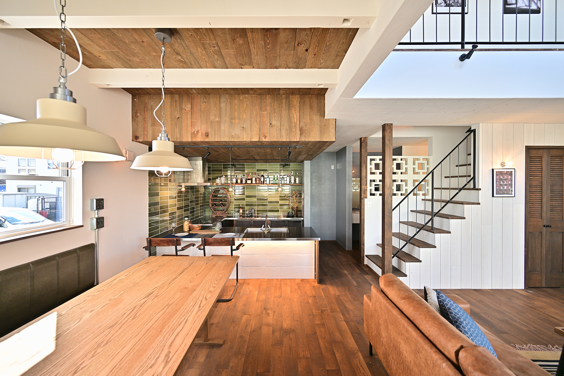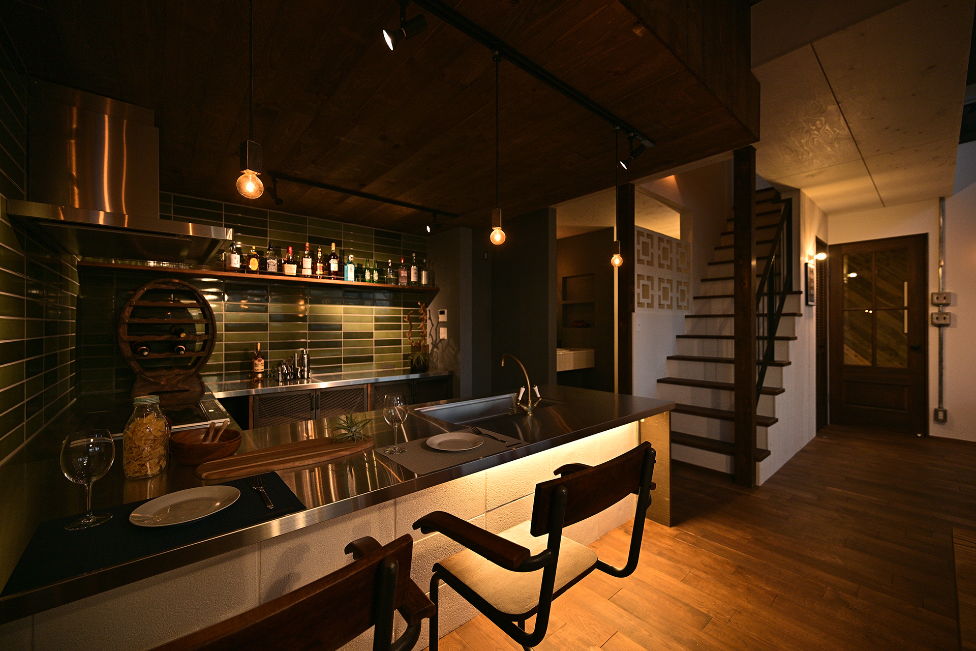 さらに、タイルの素材感やヴィンテージ照明のあたたかな光が重なり合い、それぞれ異なる素材が絶妙なバランスで調和した空間に仕上がりました。