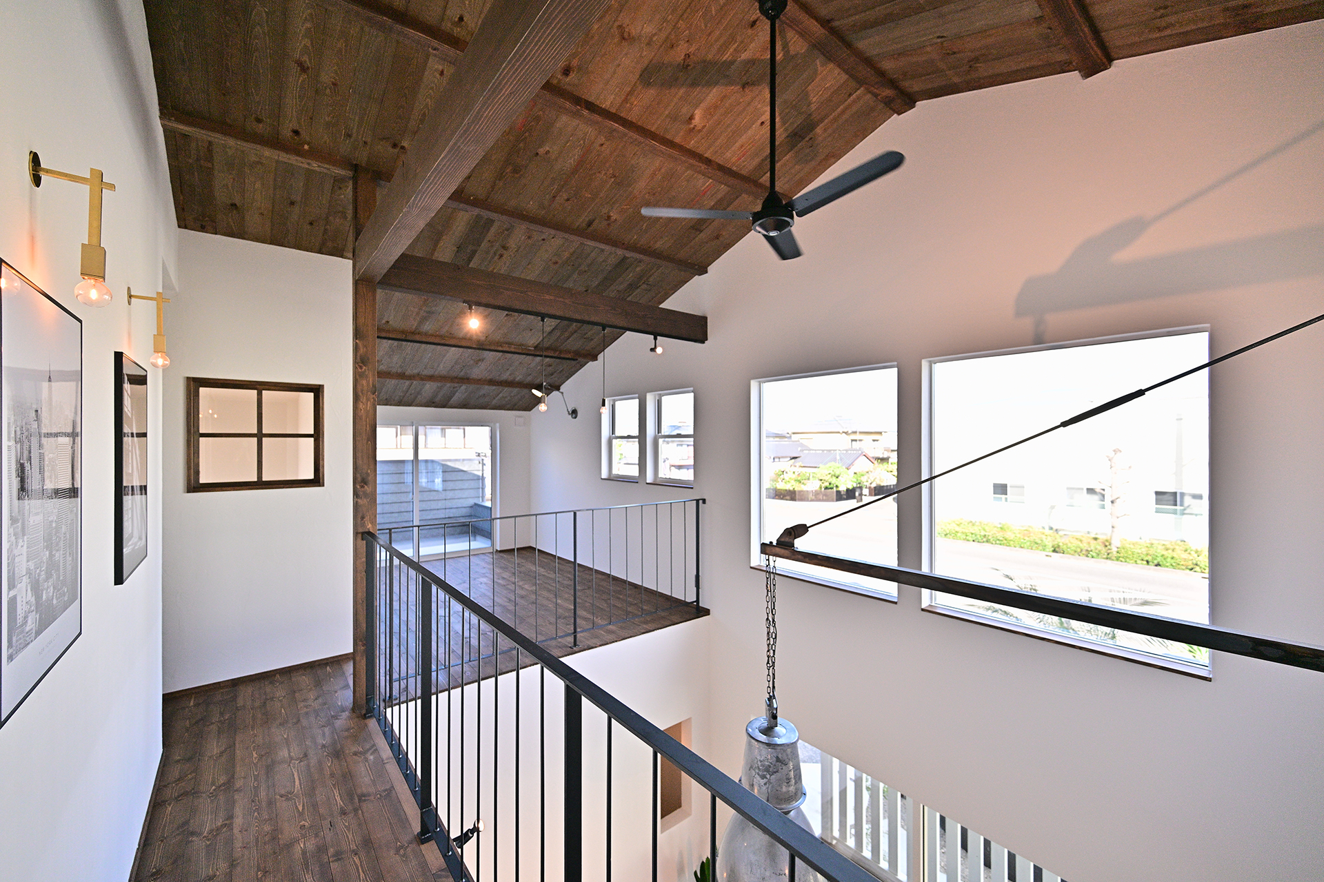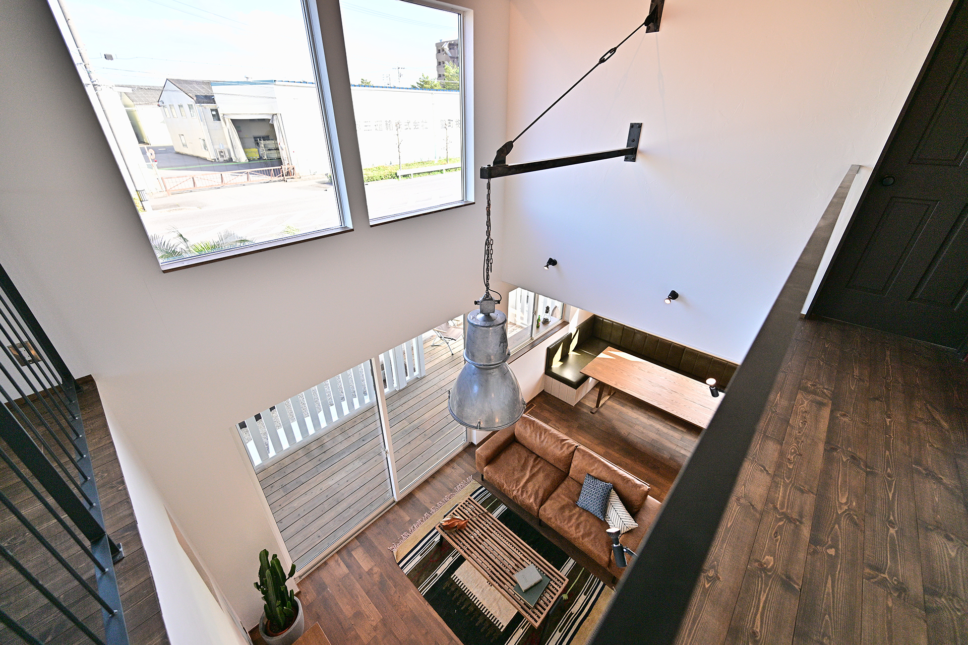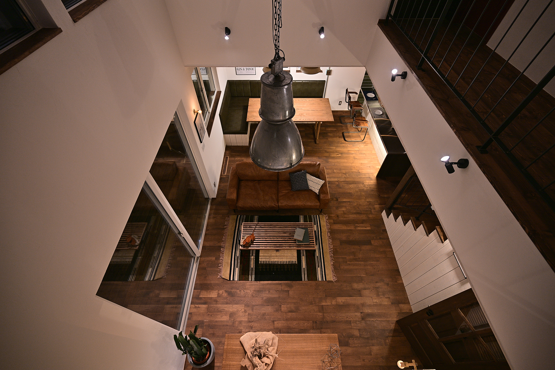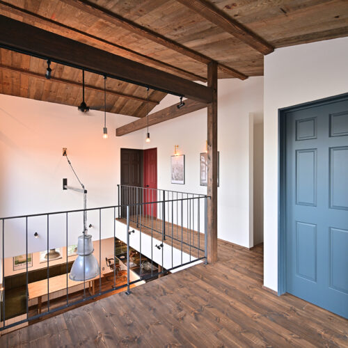 オークの無垢床のやわらかな質感、漆喰の壁が生み出す自然な陰影、アイアンの手摺がもたらす引き締まったアクセント。