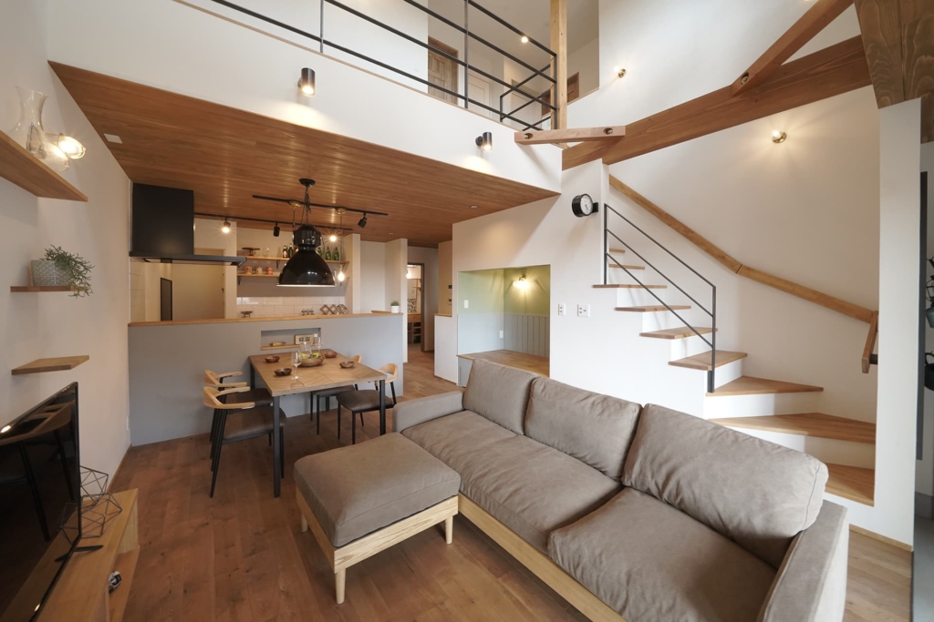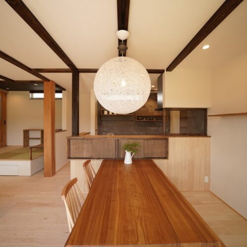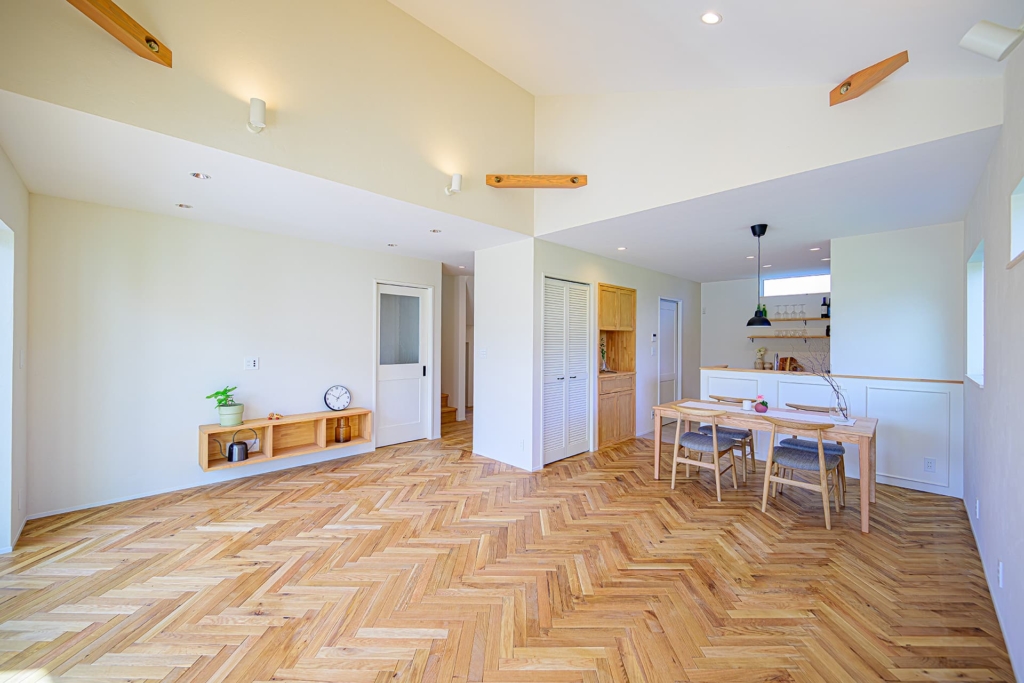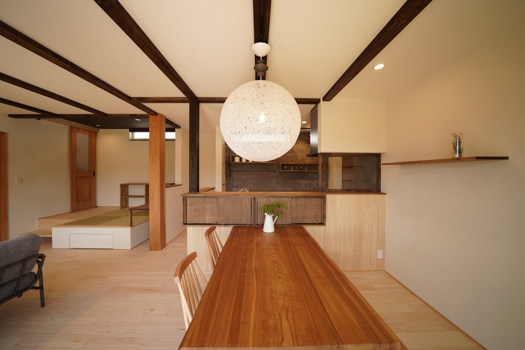無垢材のフローリングや壁、家具など、自然素材を多用し、温かみのある空間を演出します。
