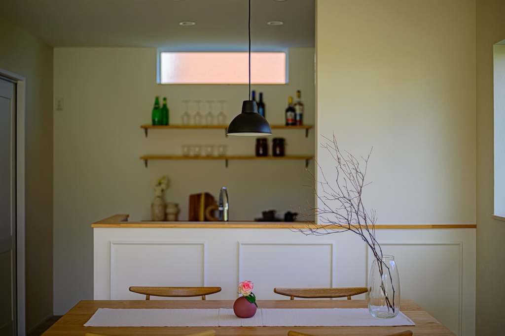 無垢材のフローリングや壁、家具など、自然素材を多用し、温かみのある空間を演出します。