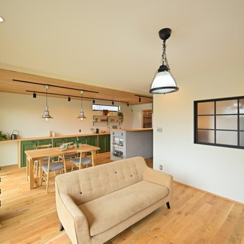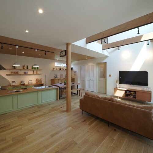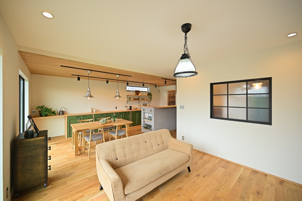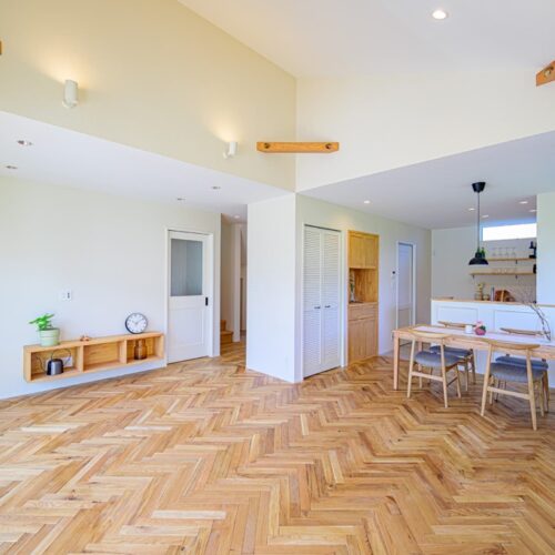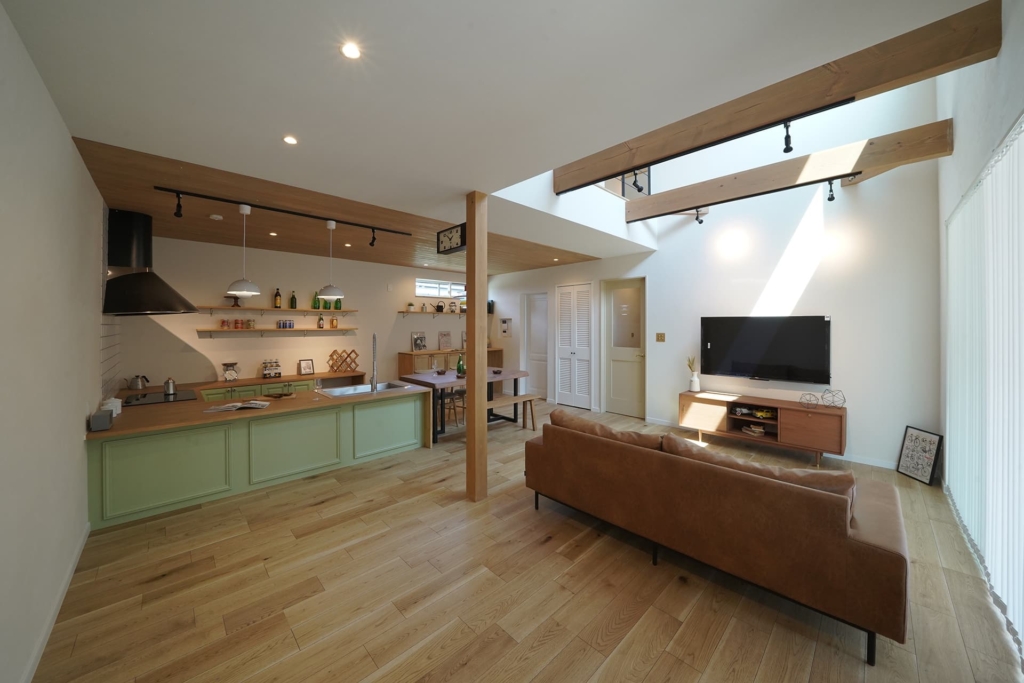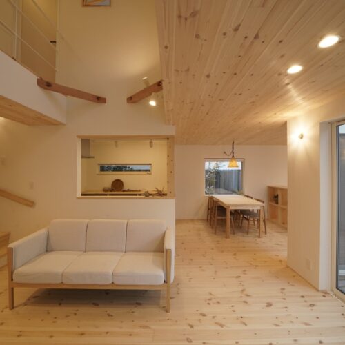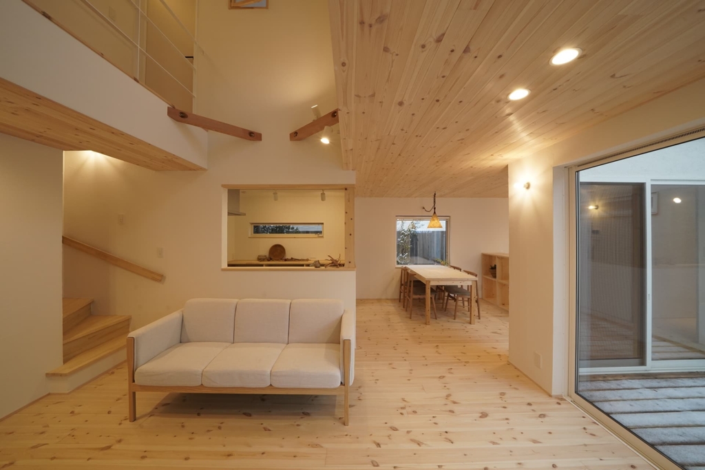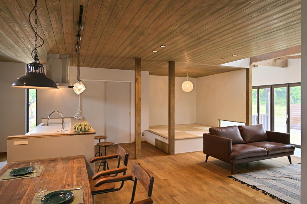 無垢材のフローリングや壁、家具など、自然素材を多用し、温かみのある空間を演出します。