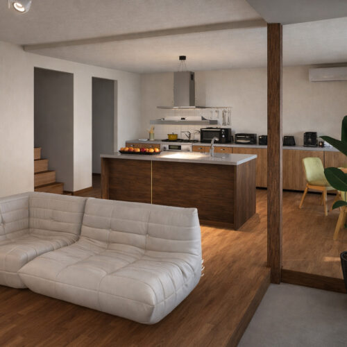 無垢材の床やエイジング加工の天井、ブロックタイルのキッチン腰壁など、素材の表情を活かした空間。