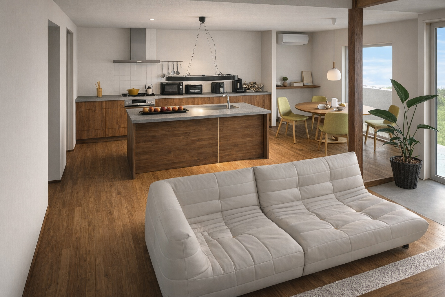 キッチン・ダイニング・リビング・庭が一直線につながる開放的なLDKです。