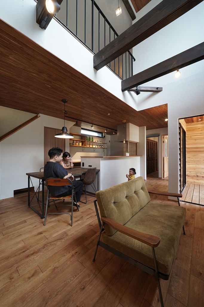 家族が集うLDKは、大きな吹抜けで解放感があり、LDKに面したウッドデッキで内と外の繋がりを作ります。