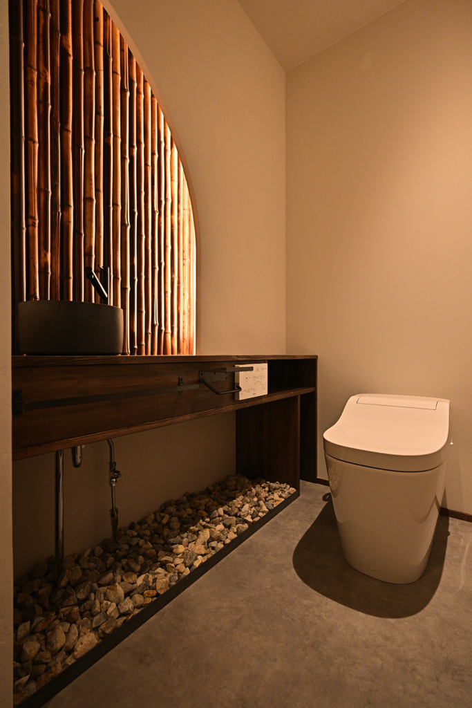 ・竹や砂利を使ったインテリアで細部までこだわったトイレ