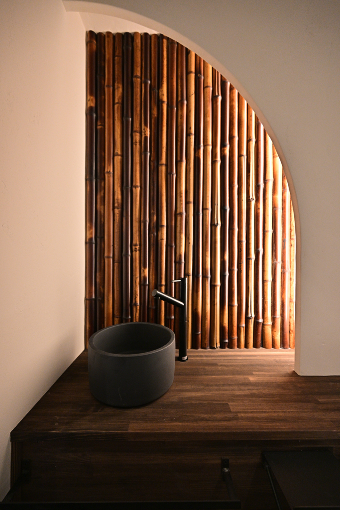 玄関ニッチと同じ竹をあしらった壁と、陶器の洗面ボウル、地元のさなげ石を敷いた床が、