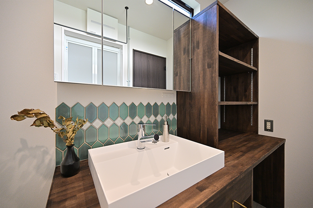 六角形のタイルが印象的な洗面台。三面鏡と造作の収納棚で収納力もバッチリ。