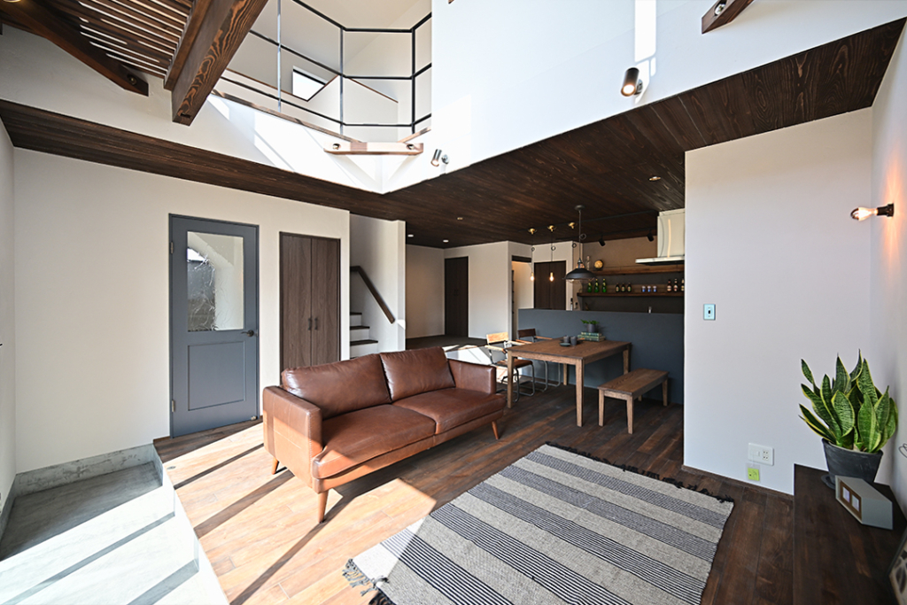 庭に繋がる土間とウッドデッキが部屋を広く見せてくれ、天井は吹き抜けで開放的な空間に。
