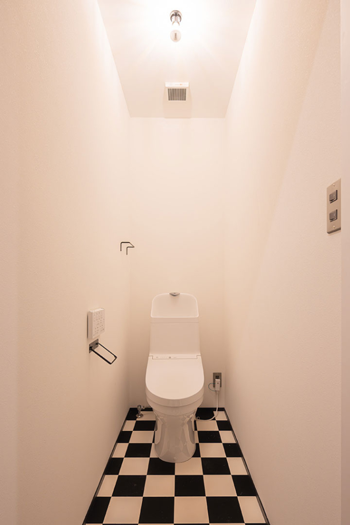 2Fのトイレは、真っ白な壁紙に白と黒のブロックチェックの床でモダンな印象。