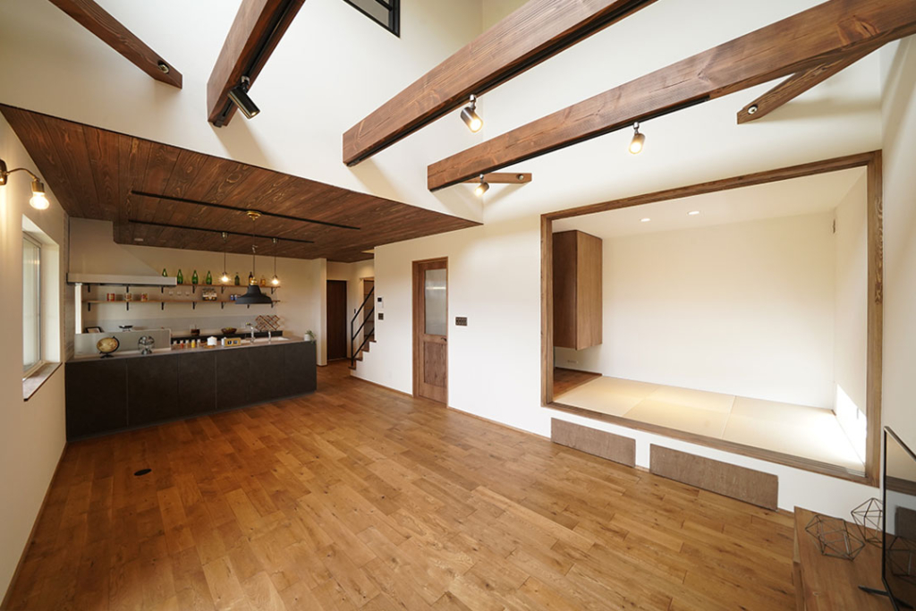 床や梁にはダークブラウン×壁にパーシモンEウォールのNUTSを使用しました。