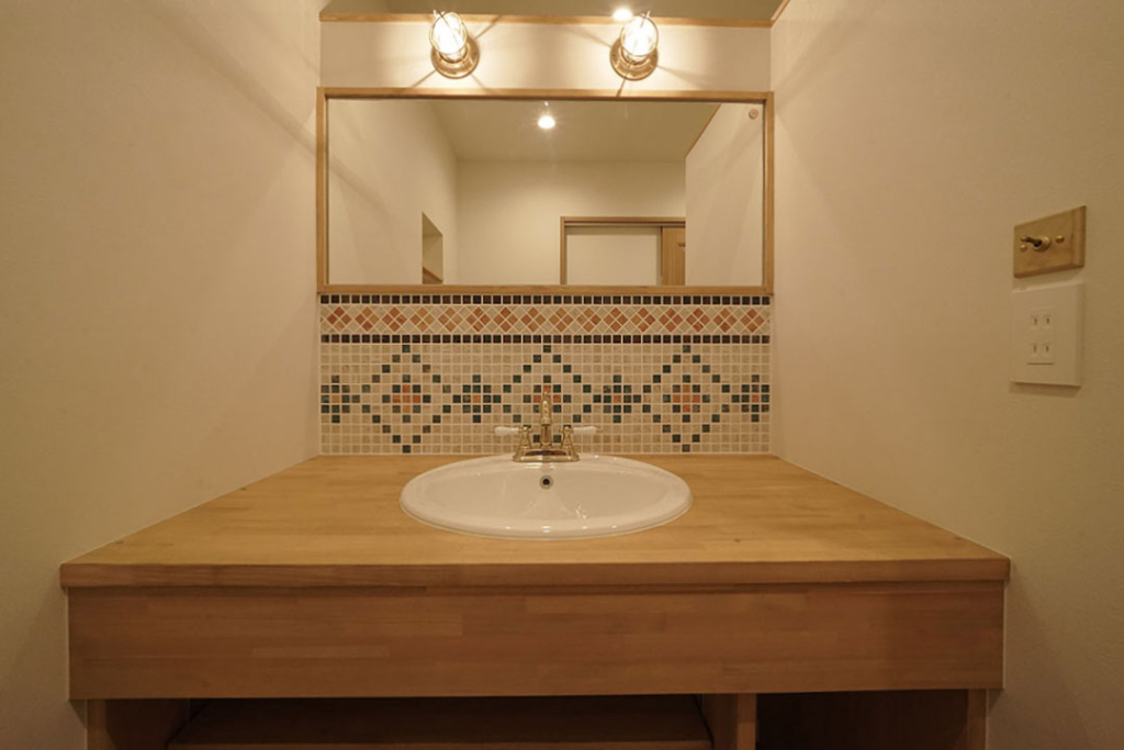 ・洗面所には特注のモザイクタイル
