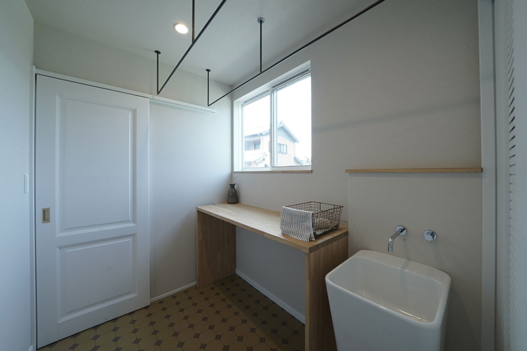 脱衣所からはランドリールームへとつながる家事動線。