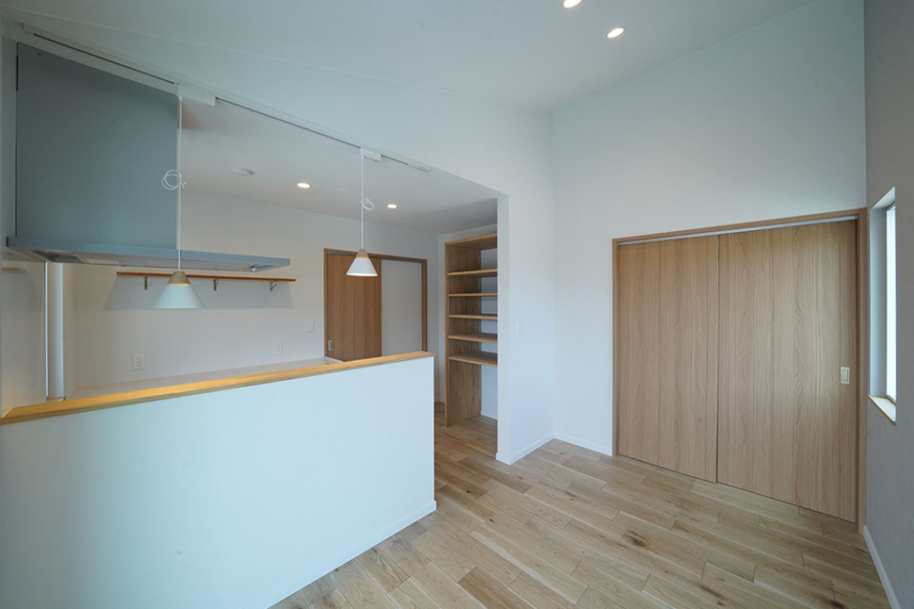 リビング床はナラ樫のフローリング材、壁はエスタコウォールを使用。
