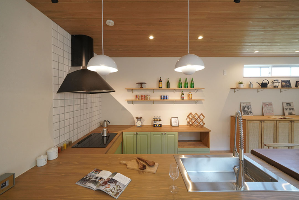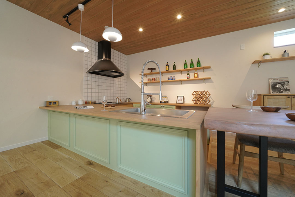 キッチンの腰壁は1600色あるペンキの色から選んでいただいた明るいグリーン。