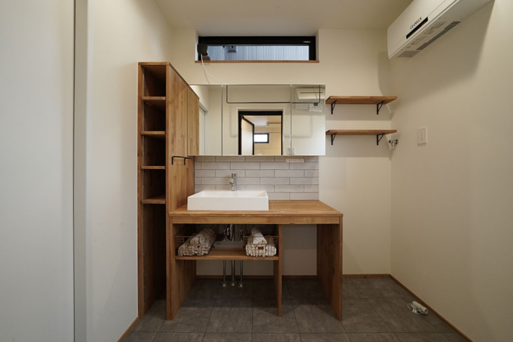 造作の洗面台と収納棚でスッキリした印象の洗面スペース。