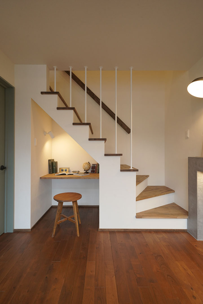 デッドスペースになりがちな階段下ですが、ちょっとした書き物や読み物などに最適なスペースに。