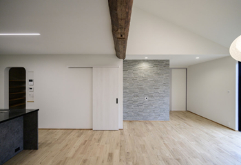 フロア材を1枚ずつ床へ貼り付けていきます。「乱貼り」という貼り方で、統一の長さのフロア材ではなく様々な長さの無垢材を貼っていく工法です。