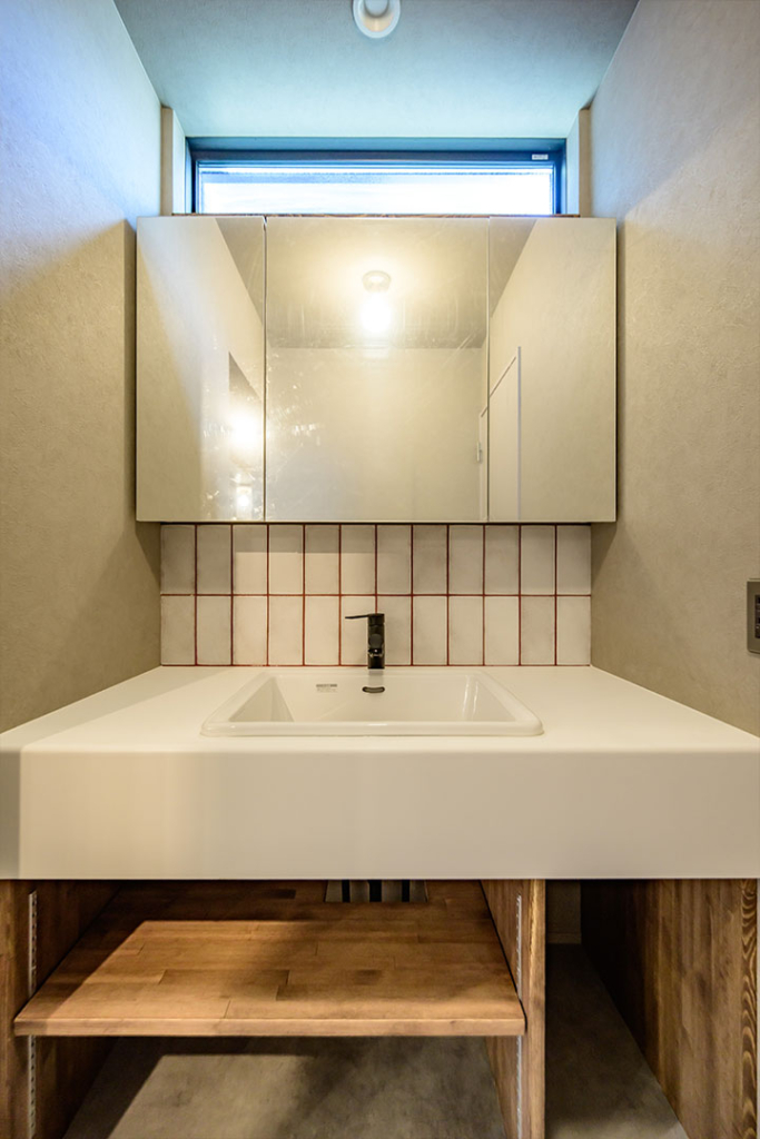 正面のタイルはシンプルなホワイトのマットなタイルですが、目地をえんじ色にして変化をつけました。