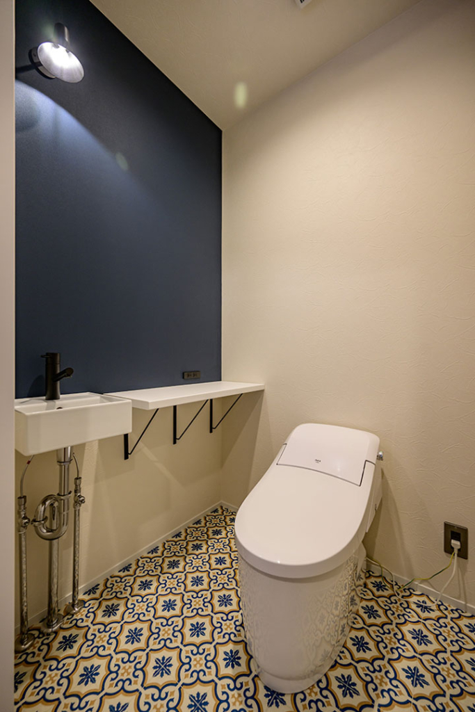 ネイビーのアクセントクロスと青と黄色のパターンが入った床が印象的なトイレ。