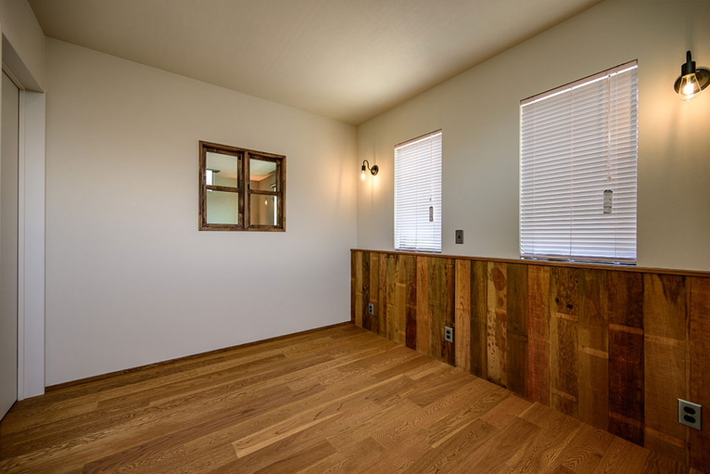 主寝室は、アメリカンな雰囲気で腰壁をふかして古風板を貼っています。