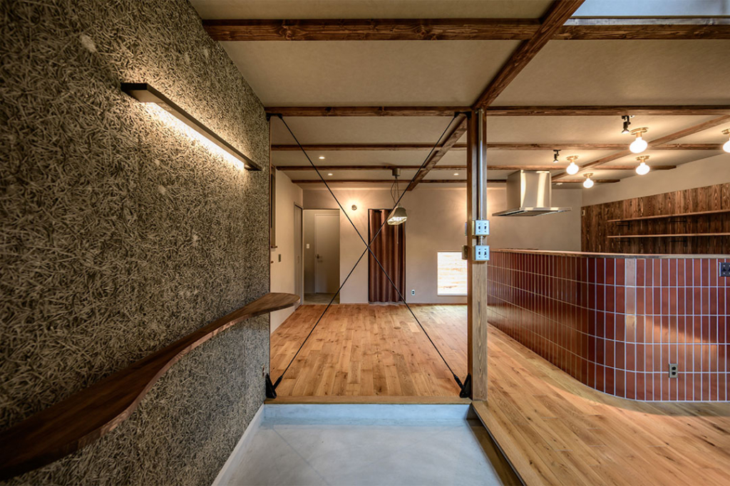 玄関を入って正面には、鉄筋の筋交(コボット)を取り入れ、