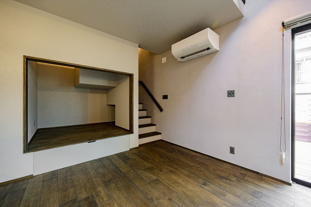 床は無垢のオーク材をブラックで塗装して使用しています。