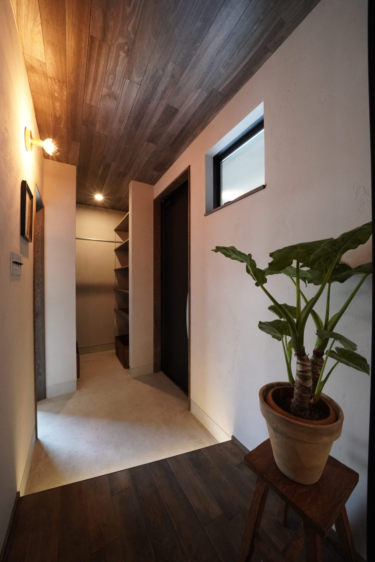 洗面スペースの天井はバイクガレージと同じボルドーグレージュを採用。素材が同じで、繋がりが見えます。