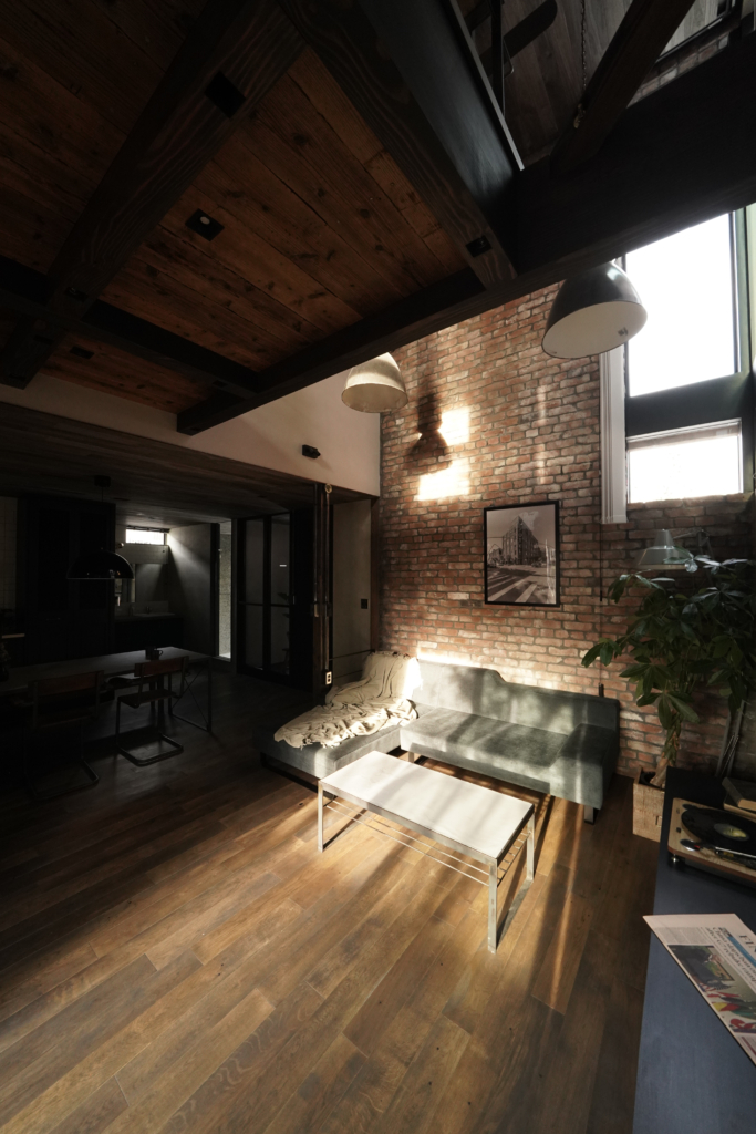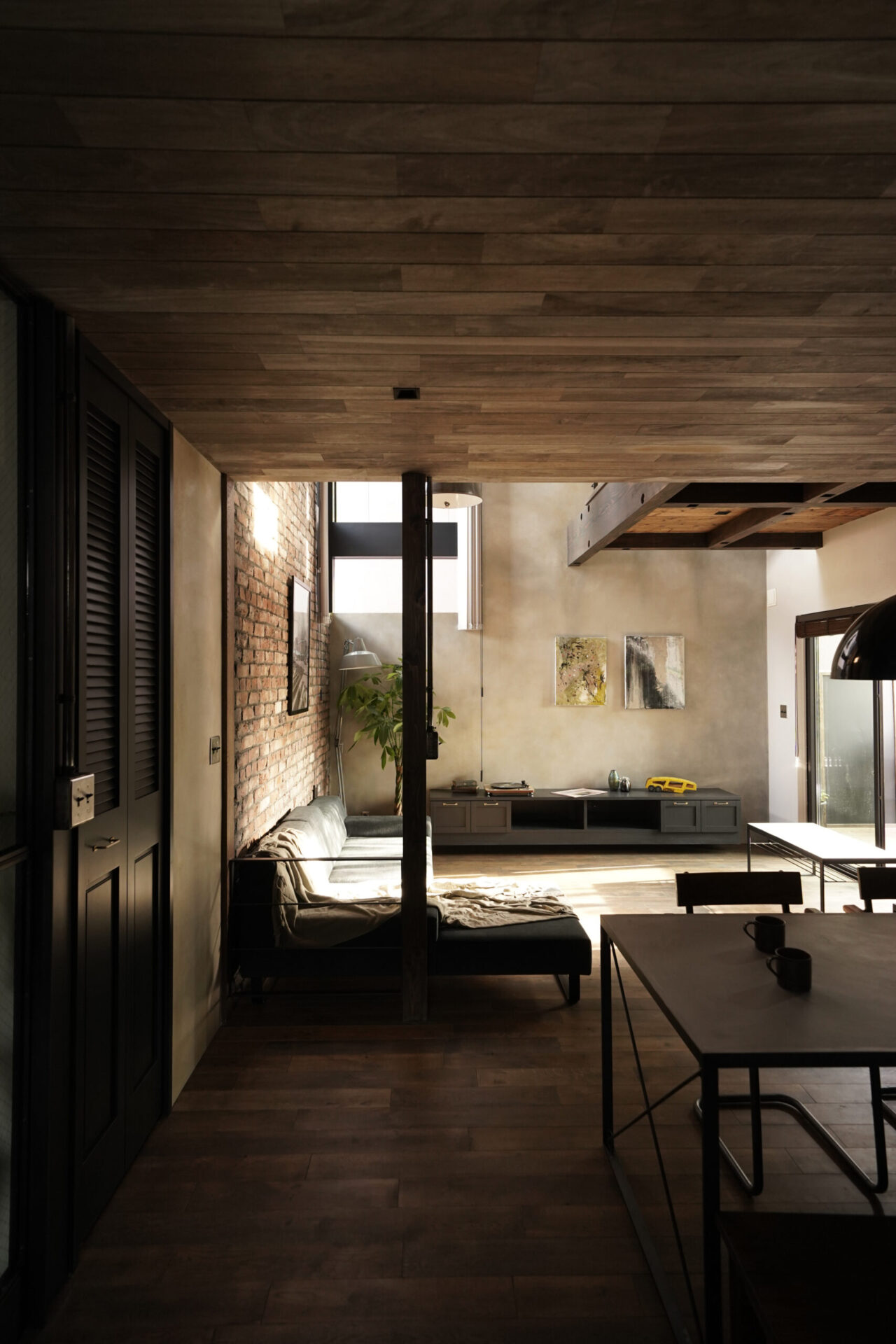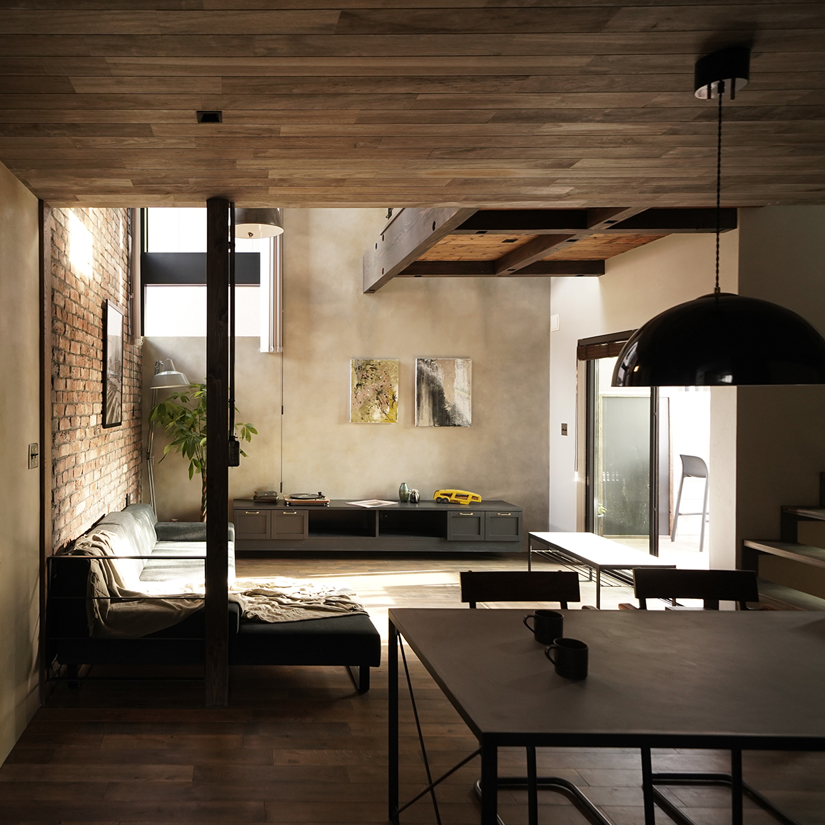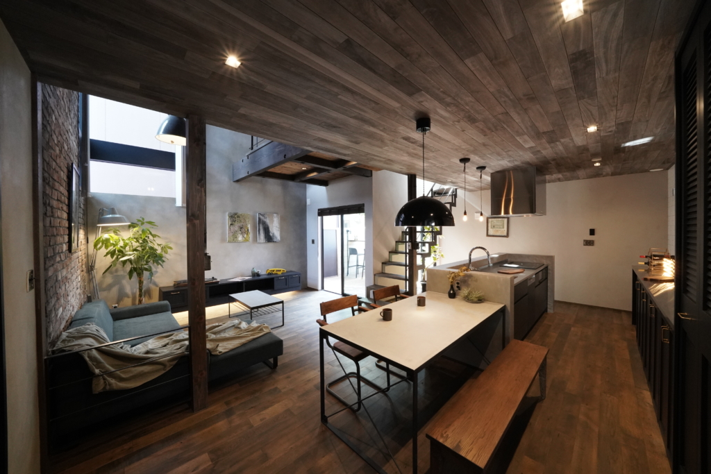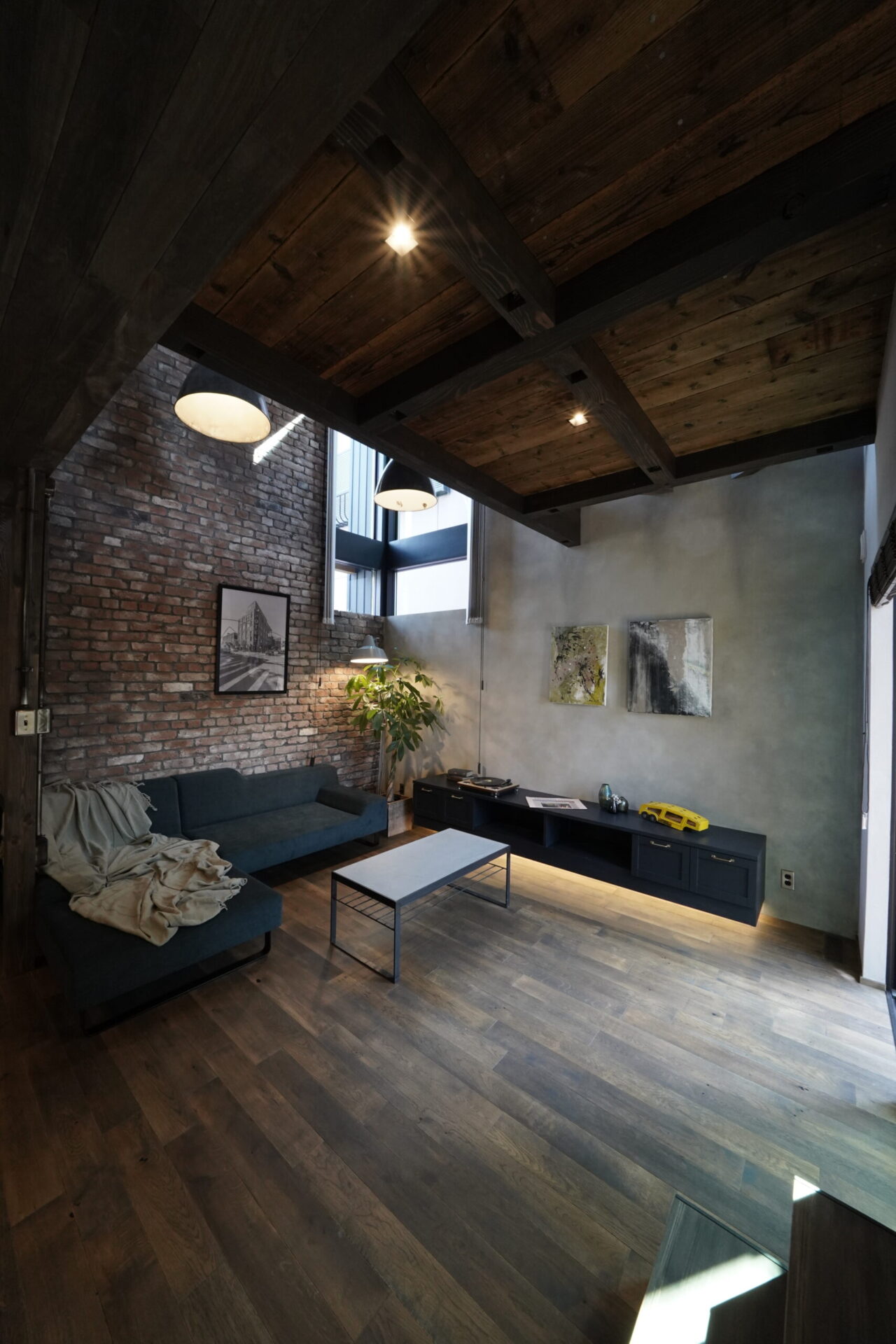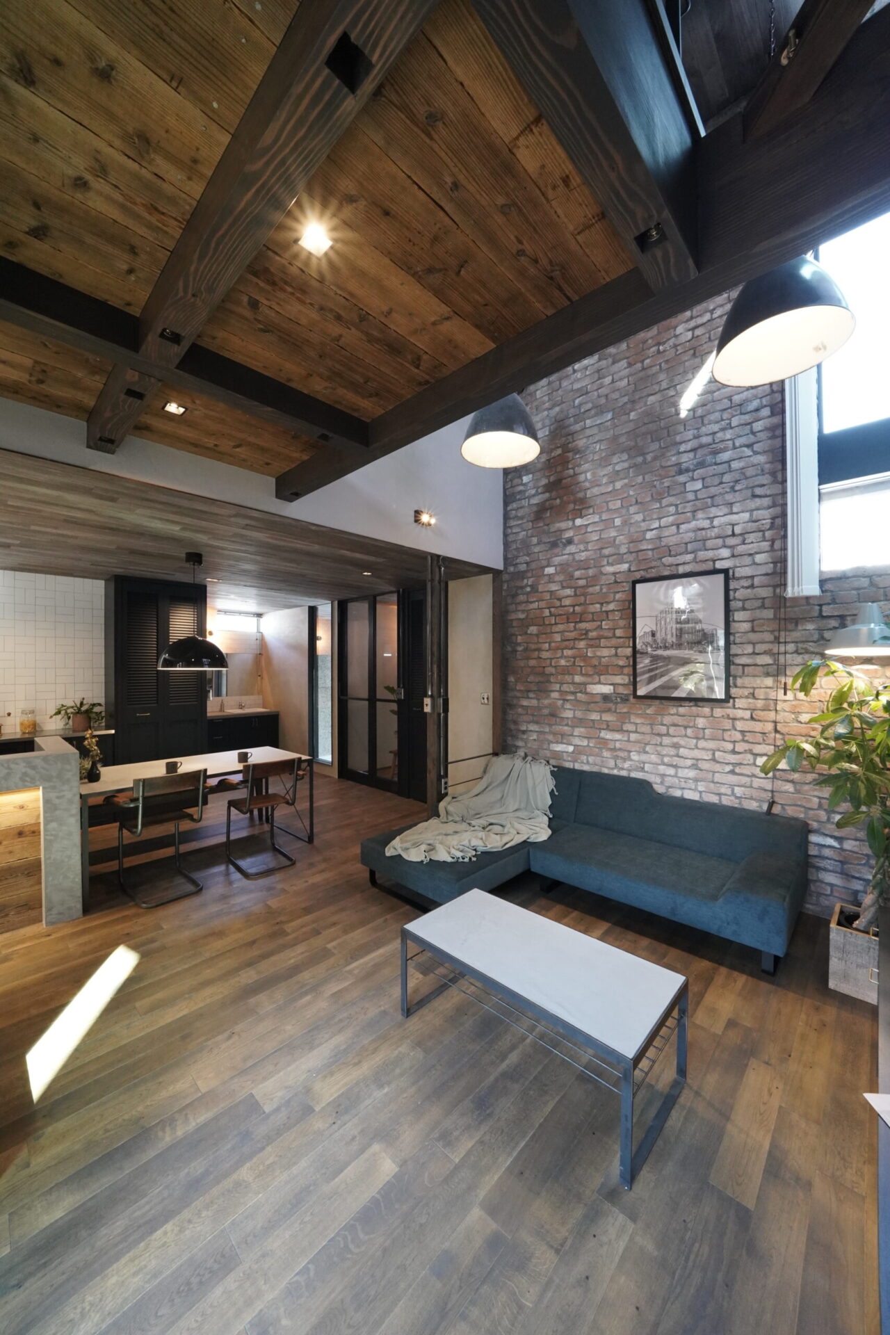 ■ブルックリンスタイルのレンガタイルにエイジング加工を施したヴィンテージ感のあるLDKの壁