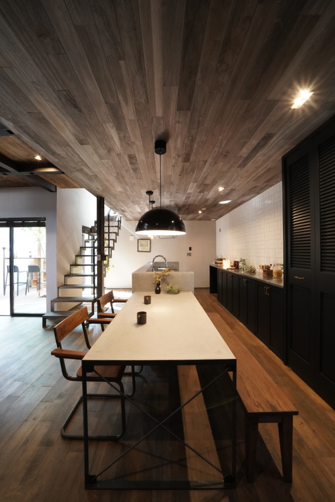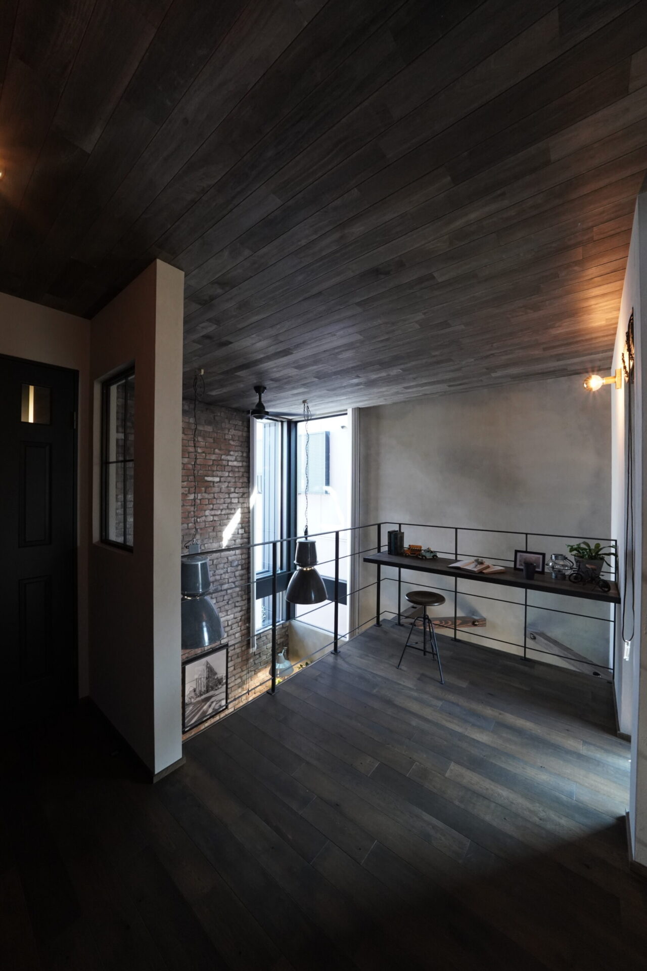 2階のホール部分には、アイアンの縁取りで支える木製のカウンターを。