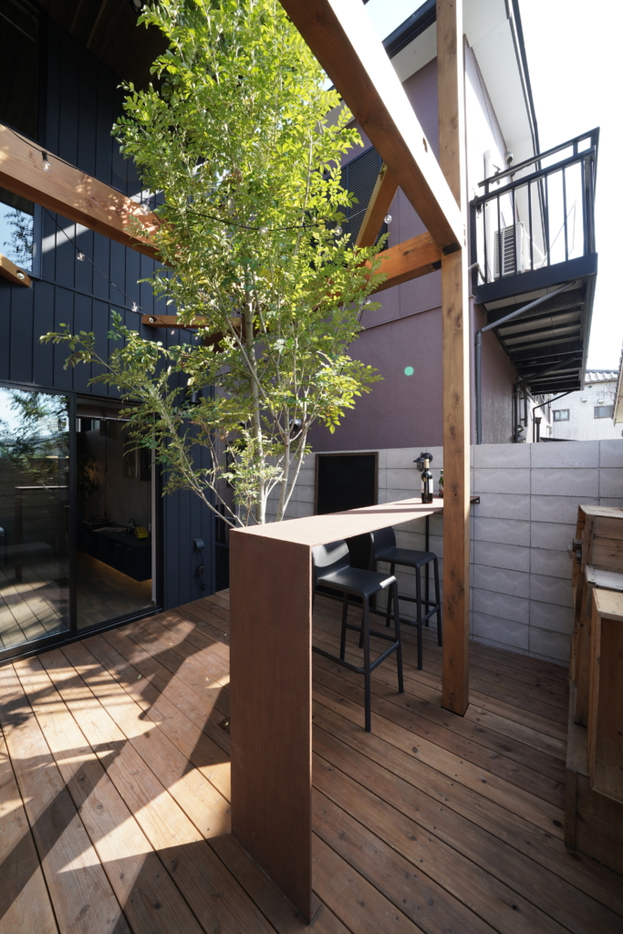 ■ウッドデッキと天井まで届くシマトネリコの一本木、アイアンのカウンターテーブルを設置した中庭