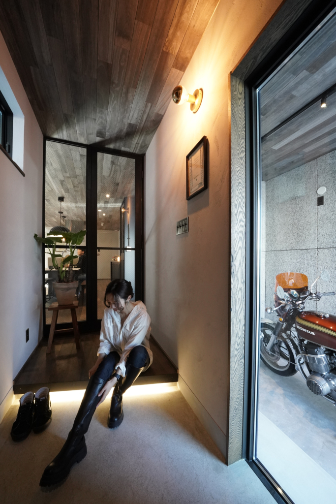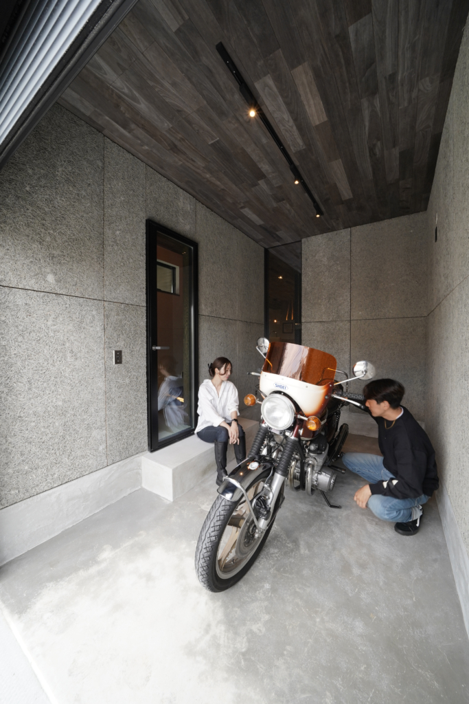 ■木毛セメントとボルドーグレージュの天板で仕上げたバイクガレージ