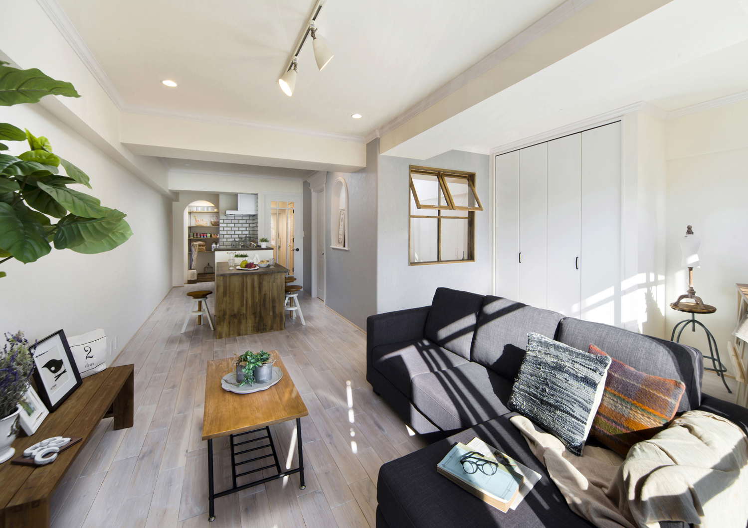 天井や床、壁の全てが白ベースで統一され 爽やかで明るい室内