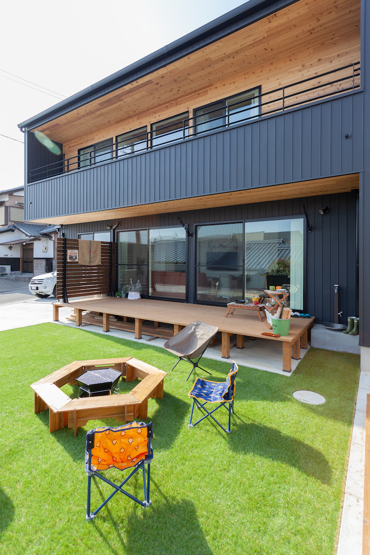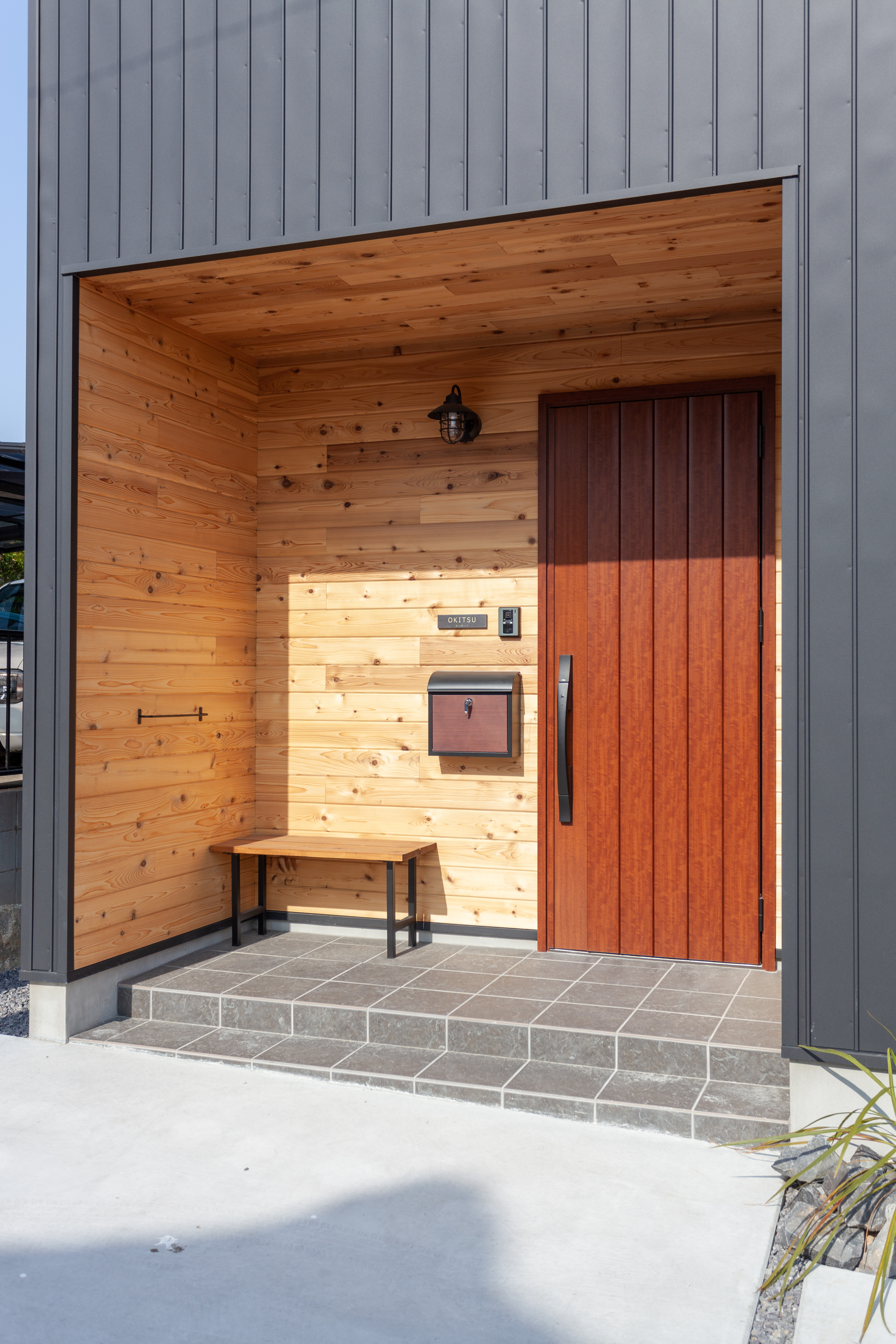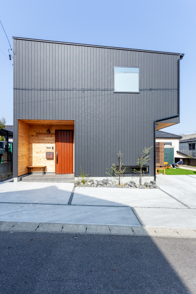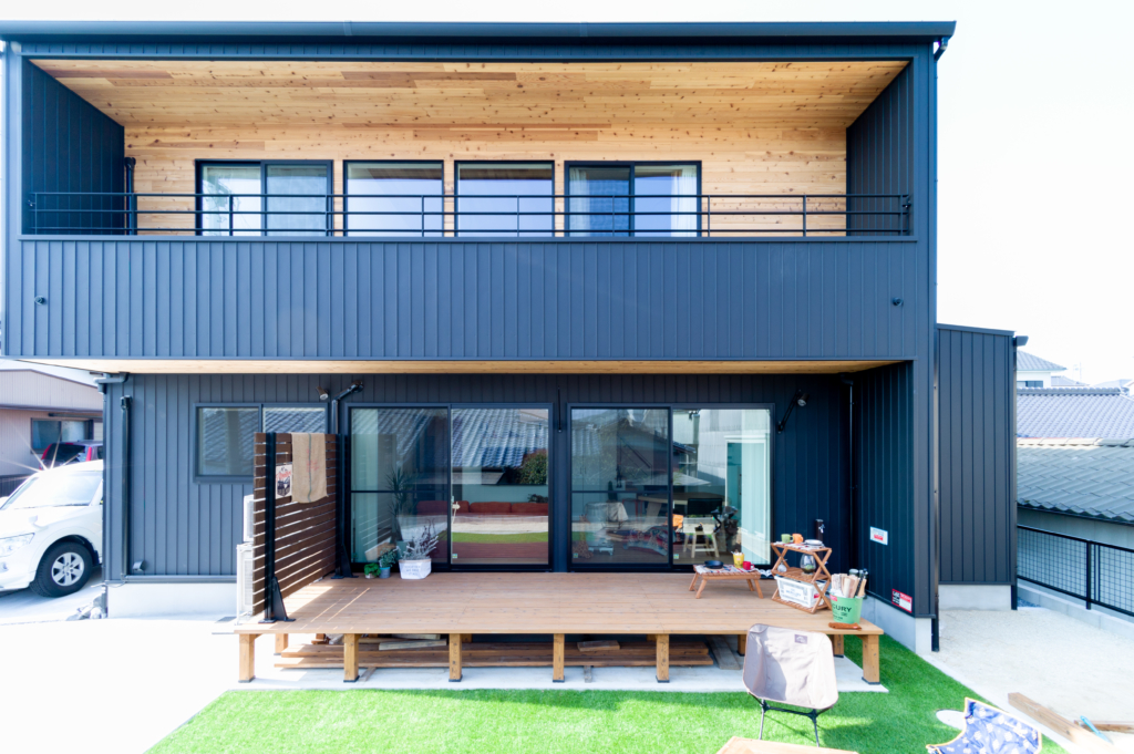 黒色のガルバリウム鋼板にレッドシダーの外壁が映えます。