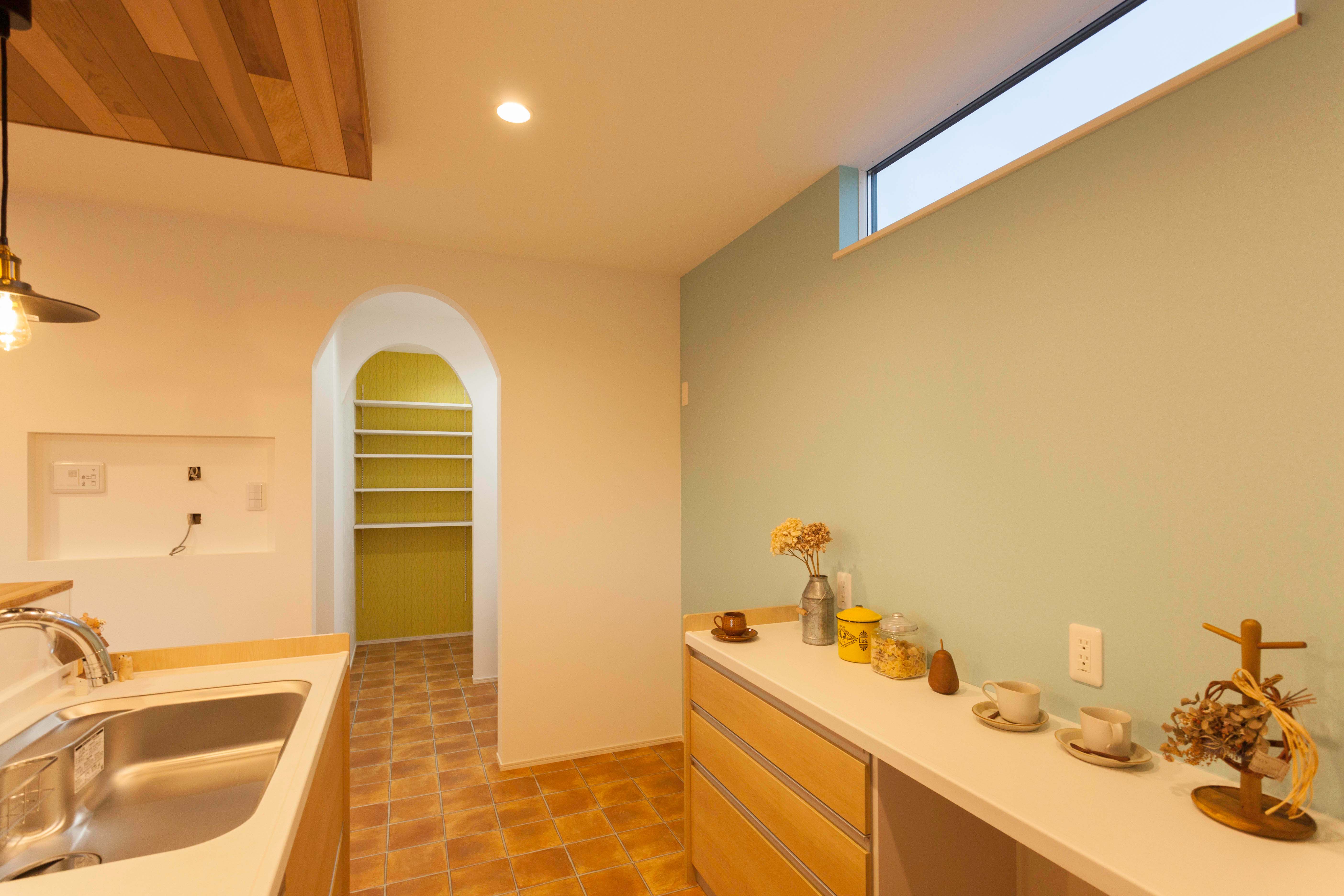 扉やキッチン壁の色がアクセントになり、遊び心のある楽しい空間になっています。