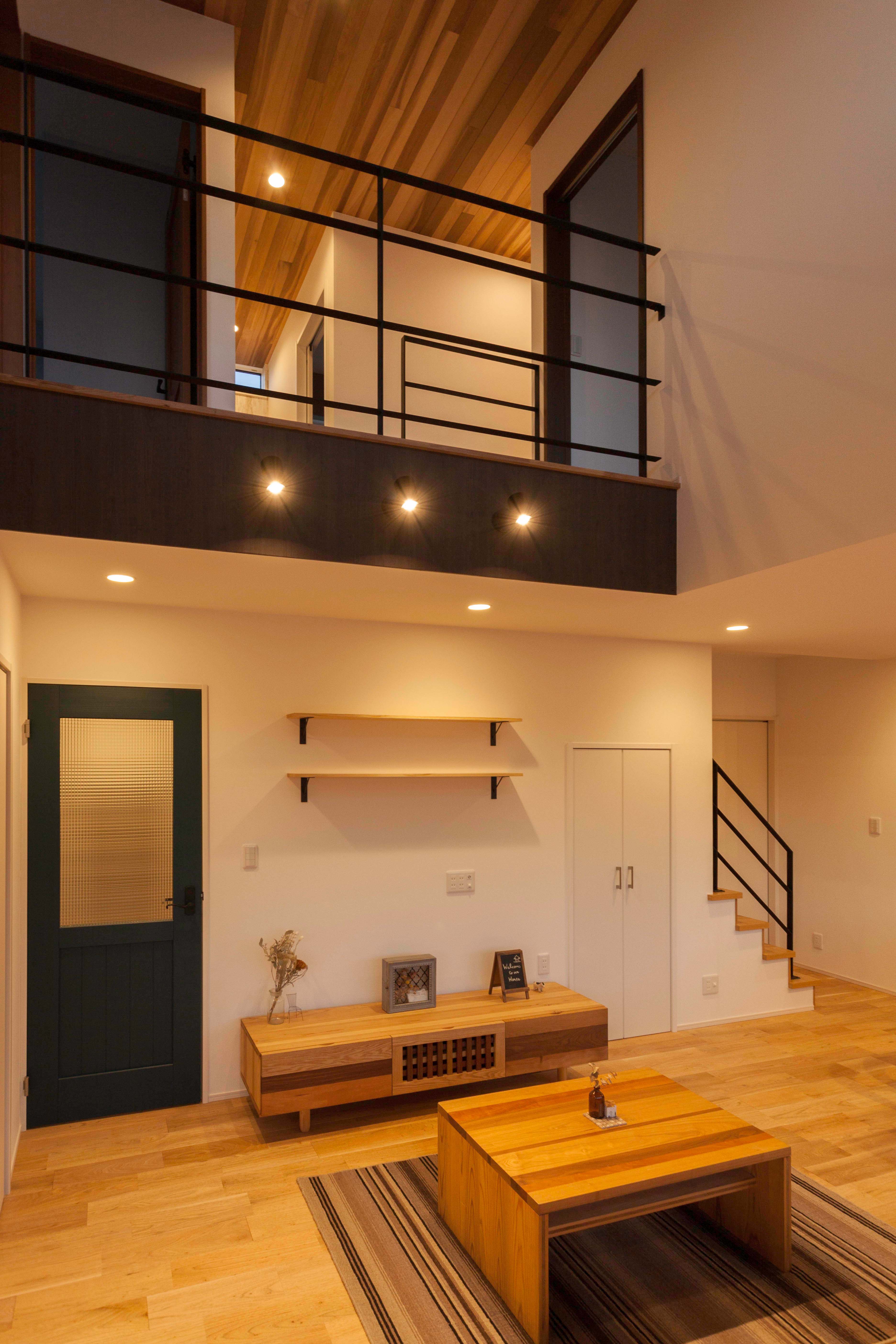 吹き抜けの天井には外壁と同じレッドシダー貼り。赤味がかった色合いであたたかみがあり、表情豊かです。