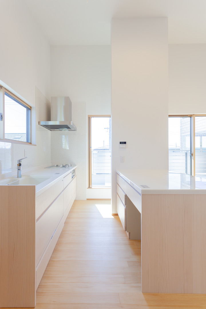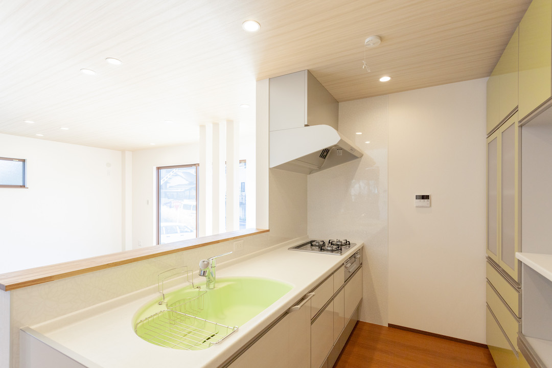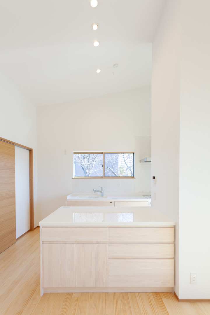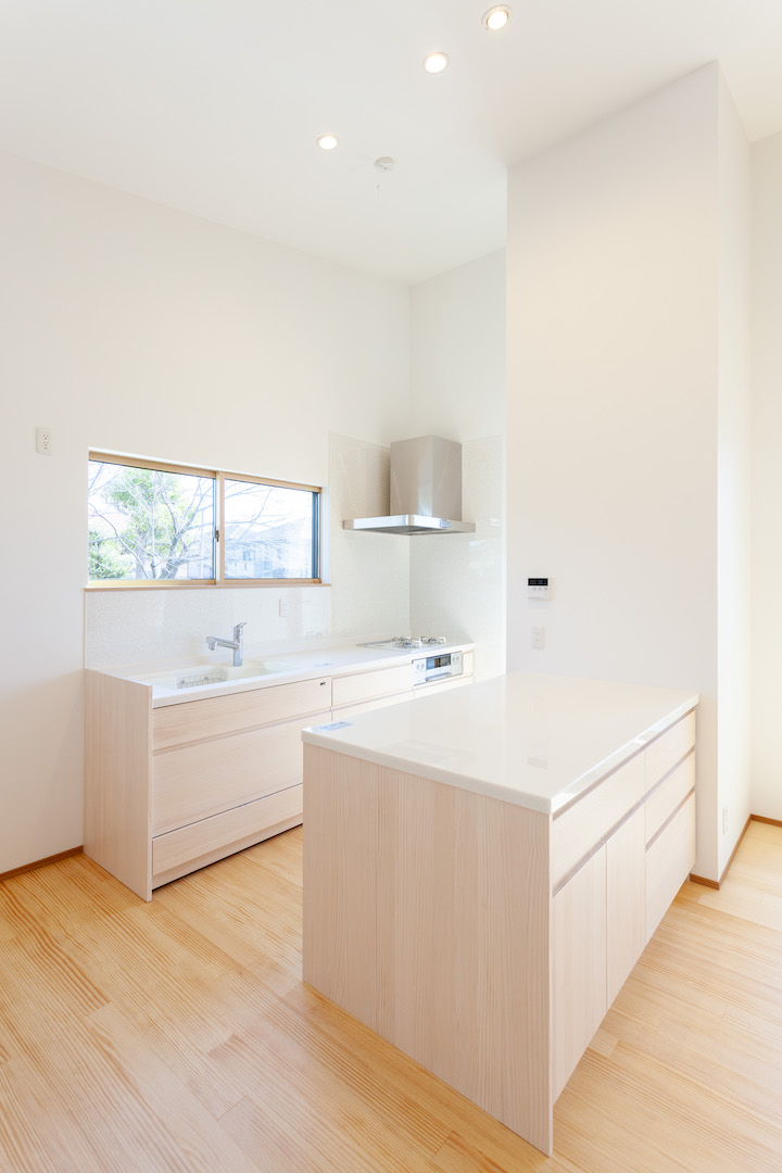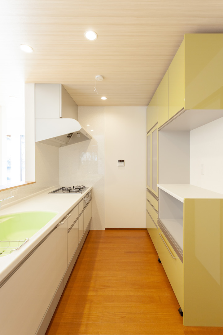 キッチンはウッドワンのスイージーです。無垢の扉ですが、油性ペンで書いても消せるすぐれものです。