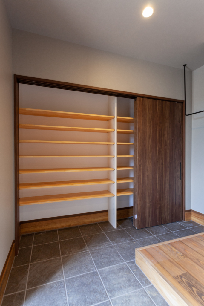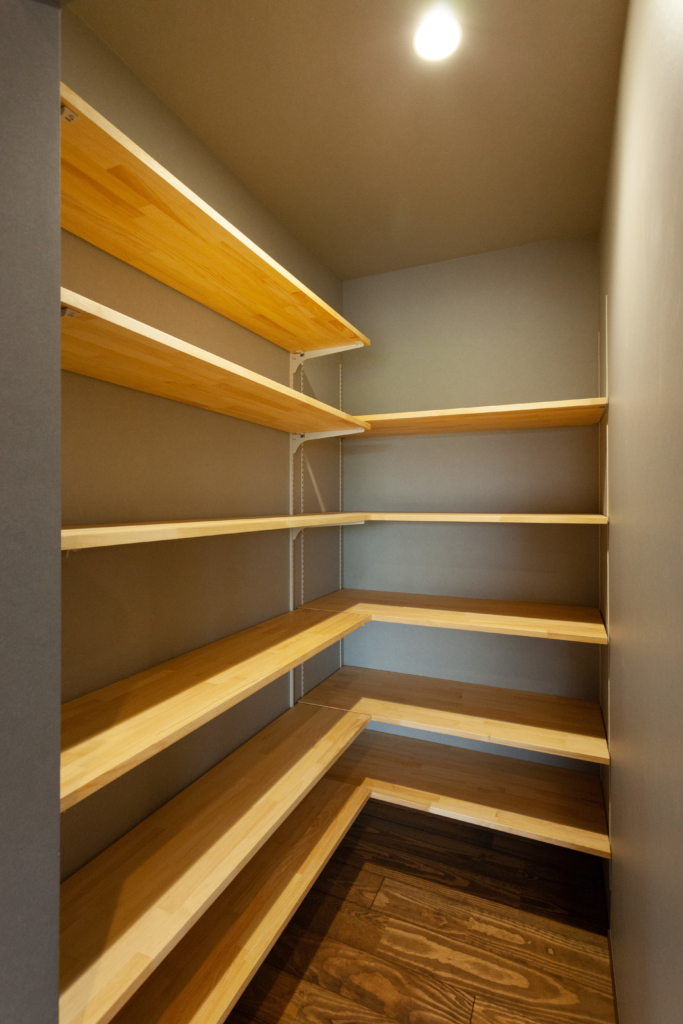 キッチンの横にひっそりと設けられてパントリーは人目につきにくいので建具は付けずに使い勝手を優先しました。