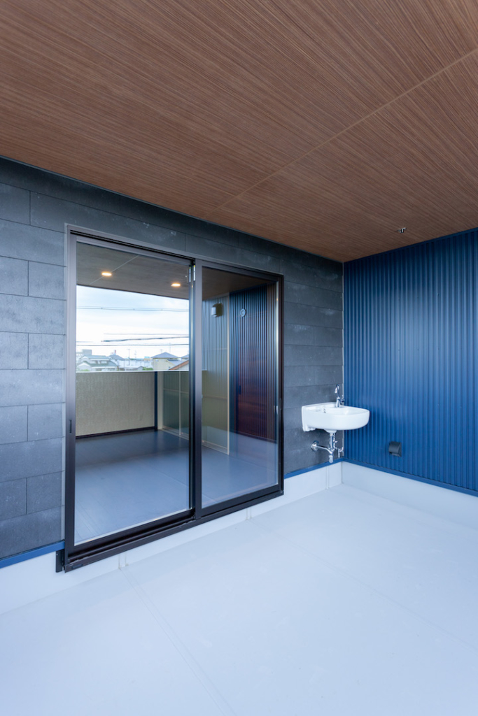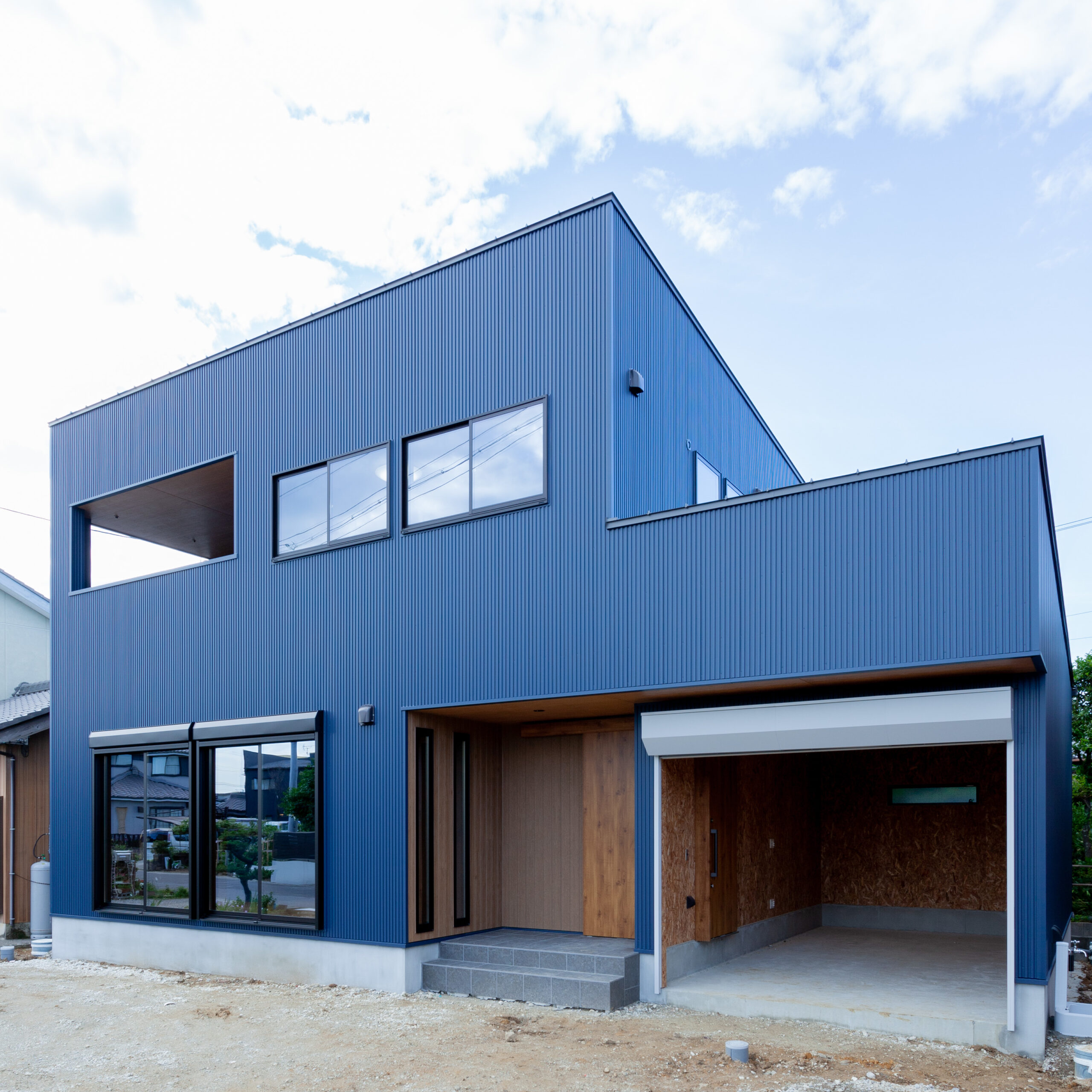外壁には、ネイビーのガルバリウム鋼板と玄関に「光セラ」サイディング、