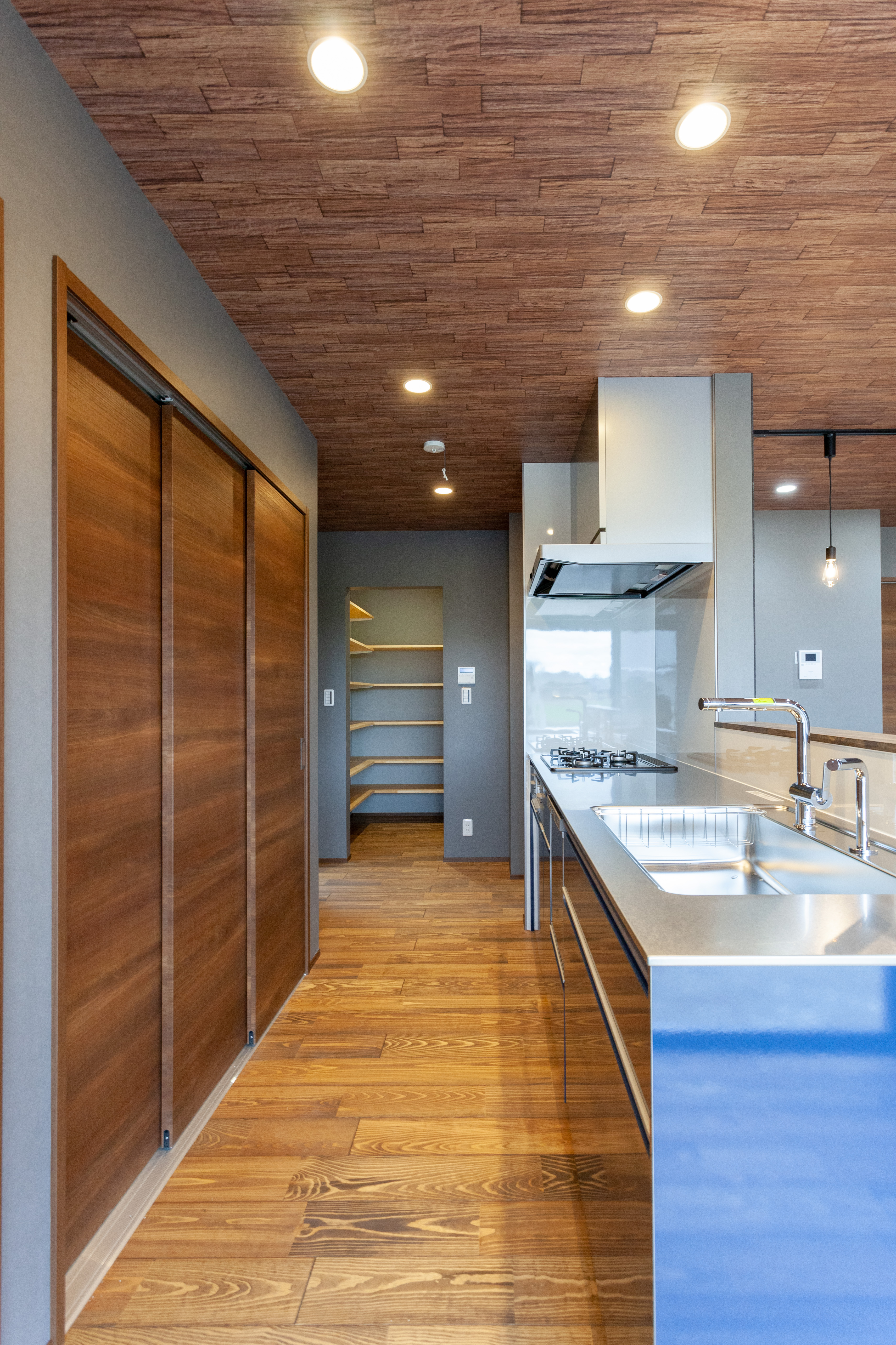 キッチンの横にひっそりと設けられてパントリーは人目につきにくいので建具は付けずに使い勝手を優先しました。