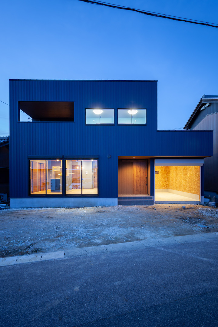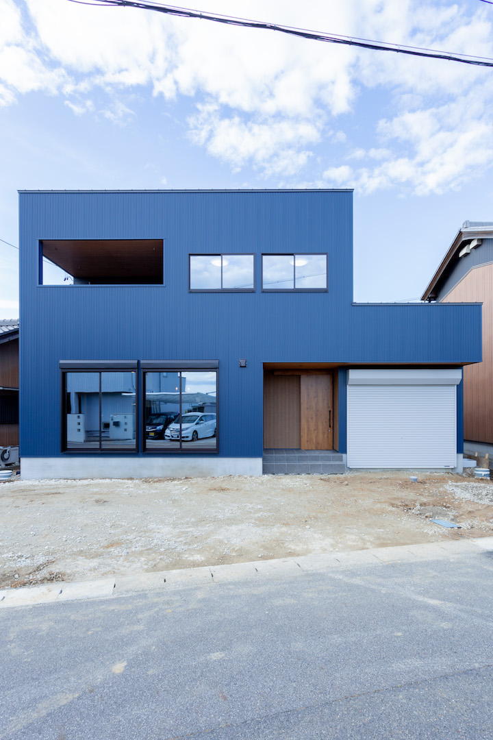 外壁には、ネイビーのガルバリウム鋼板と玄関に「光セラ」サイディング、