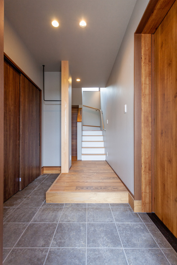 写真中央のうすだいだい色の柱は、ヒノキで大黒柱として建てました。家族の成長を見守ってくれることでしょう。
