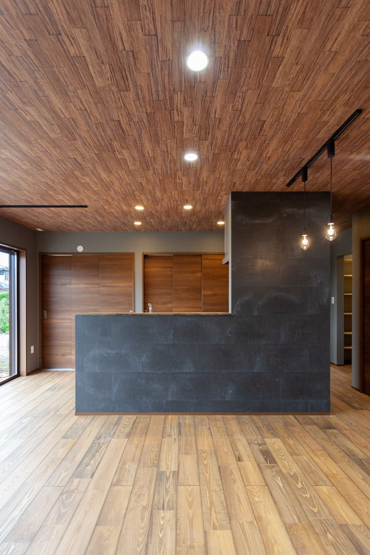 落ち着いた色合いのLDK。対面式キッチンの正面にはケイミュー社製の壁材「ソリッド」を貼り付け。