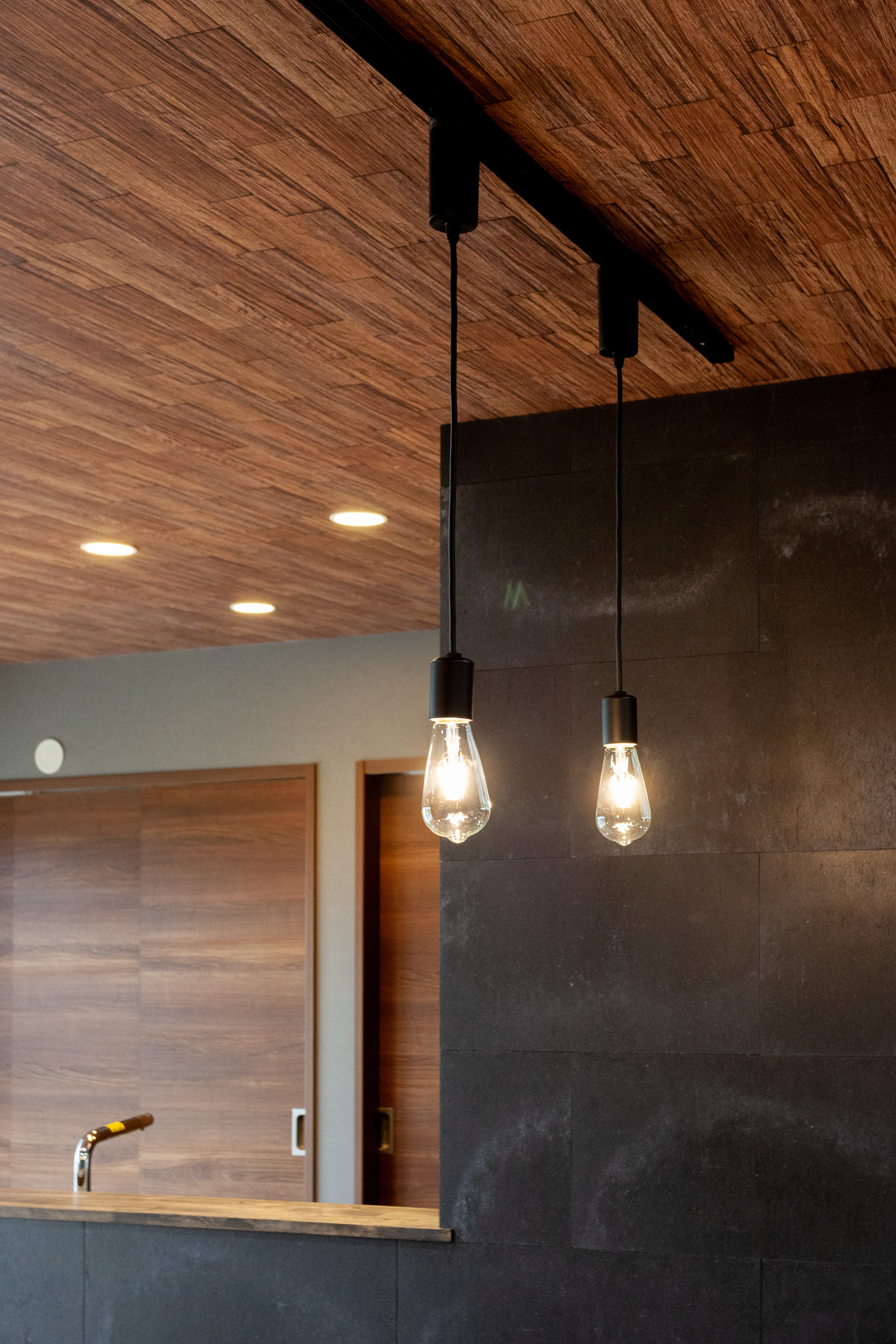 リビング・ダイニング用のペンダントライトが黒い壁の前で映えます。