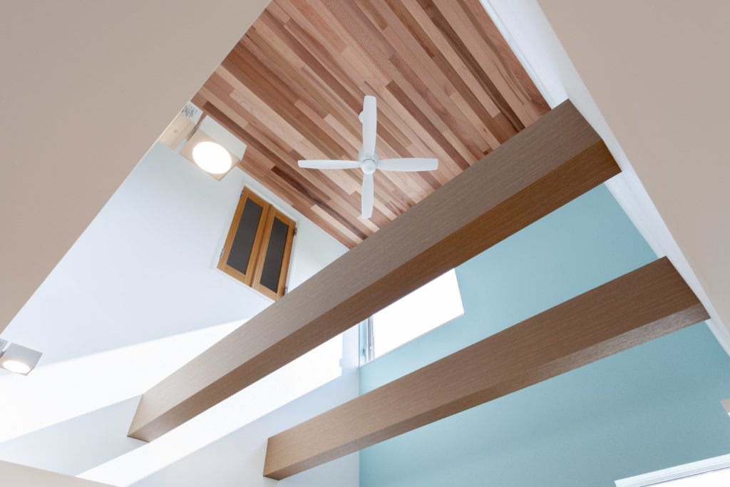 吹抜の天井はレッドシダーを貼り、おしゃれに